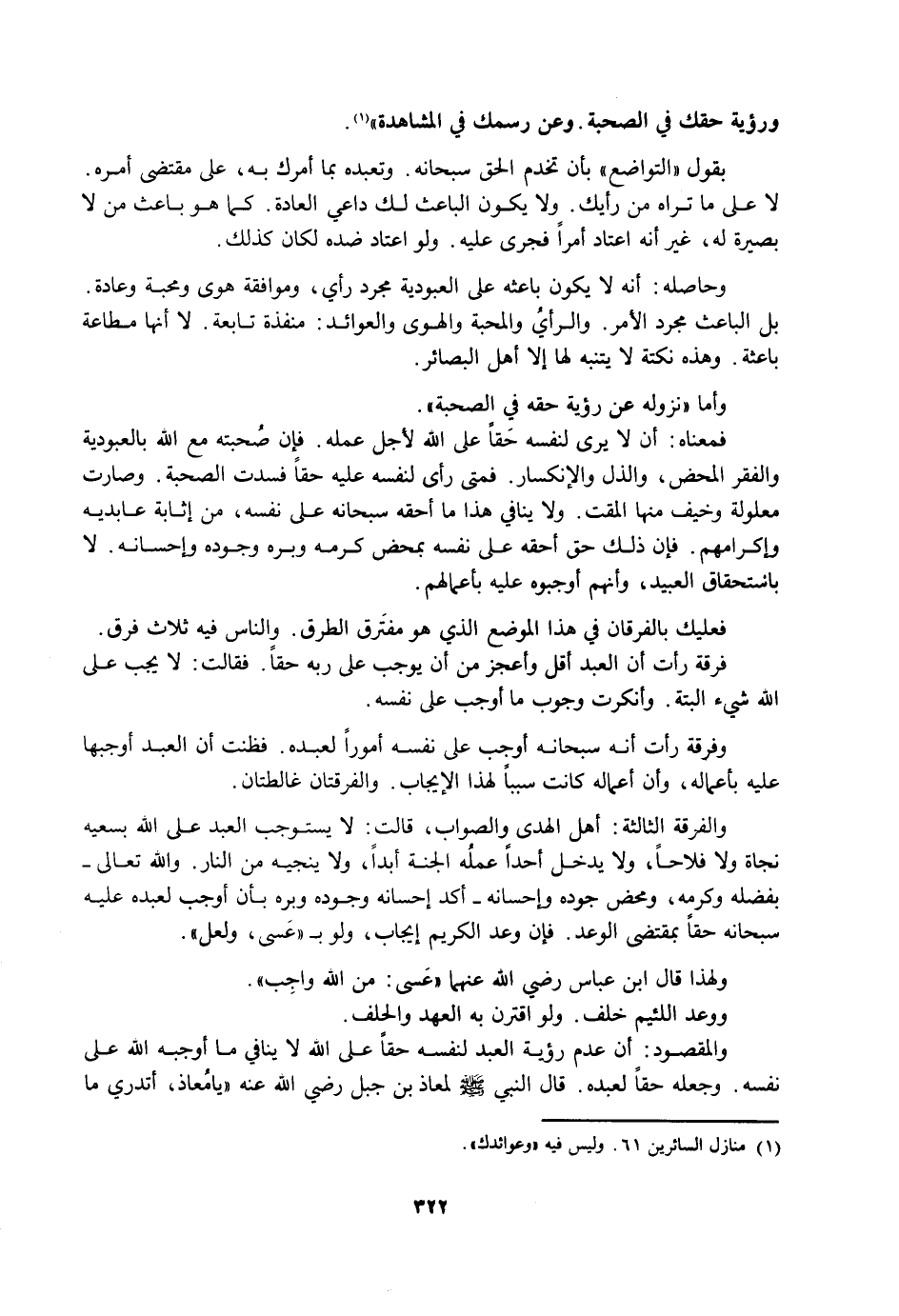 فَمَعْنَاهُ: أَنْ لَا يَرَى لِنَفْسِهِ حَقًّا عَلَى اللَّهِ لِأَجْلِ عَمَلِهِ. فَإِنَّ صُحْبَتَهُ مَعَ اللَّهِ بِالْعُبُودِيَّةِ وَالْفَقْرِ الْمَحْضِ، وَالذُّلِّ وَالِانْكِسَارِ. فَمَتَى رَأَى لِنَفْسِهِ عَلَيْهِ حَقًّا فَسَدَتِ الصُّحْبَةُ. وَصَارَتْ مَعْلُولَةً وَخِيفَ مِنْهَا الْمَقْتُ. وَلَا يُنَافِي هَذَا مَا أَحَقَّهُ سُبْحَانَهُ عَلَى نَفْسِهِ مِنْ إِثَابَةِ عَابِدِيهِ وَإِكْرَامِهِمْ. فَإِنَّ ذَلِكَ حَقٌّ أَحَقَّهُ عَلَى نَفْسِهِ بِمَحْضِ كَرَمِهِ وَبِرِّهِ وَجُودِهِ وَإِحْسَانِهِ. لَا بِاسْتِحْقَاقِ الْعَبِيدِ، وَأَنَّهُمْ أَوْجَبُوهُ عَلَيْهِ بِأَعْمَالِهِمْ.