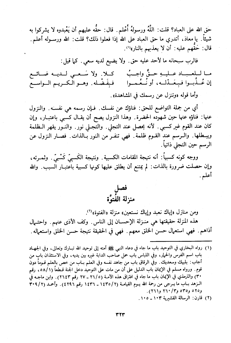 وَمِنْ مَنَازِلِ {إِيَّاكَ نَعْبُدُ وَإِيَّاكَ نَسْتَعِينُ} [الفاتحة: 5] مَنْزِلَةُ الْفُتُوَّةِ