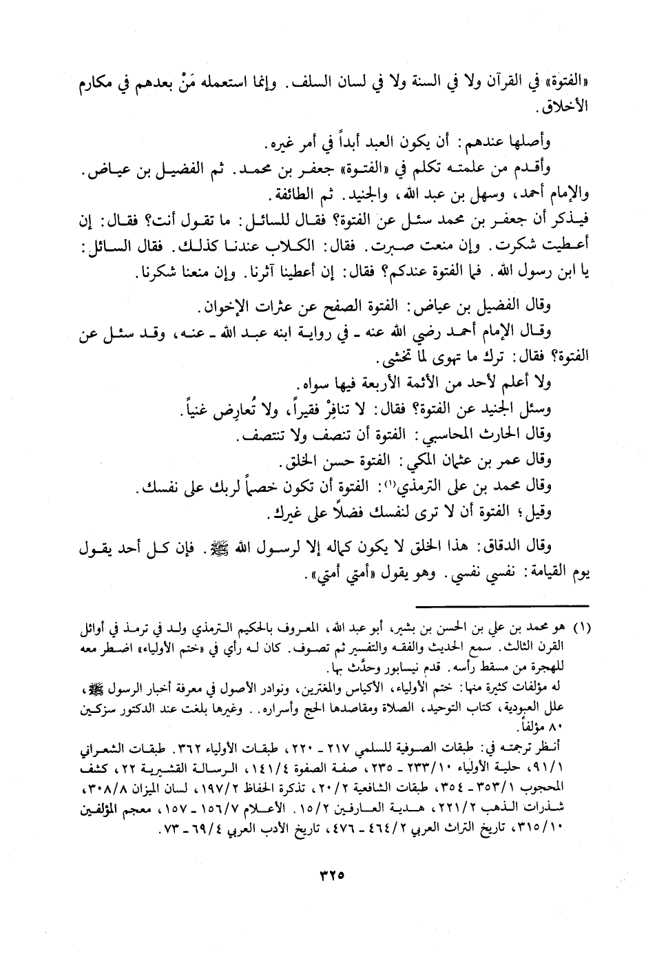 وَأَقْدَمُ مَنْ عَلِمْتُهُ تَكَلَّمَ فِي الْفُتُوَّةِ جَعْفَرُ بْنُ مُحَمَّدٍ. ثُمَّ الْفُضَيْلُ بْنُ عِيَاضٍ. وَالْإِمَامُ أَحْمَدُ، وَسَهْلُ بْنُ عَبْدِ اللَّهِ، وَالْجُنَيْدُ. ثُمَّ الطَّائِفَةُ.