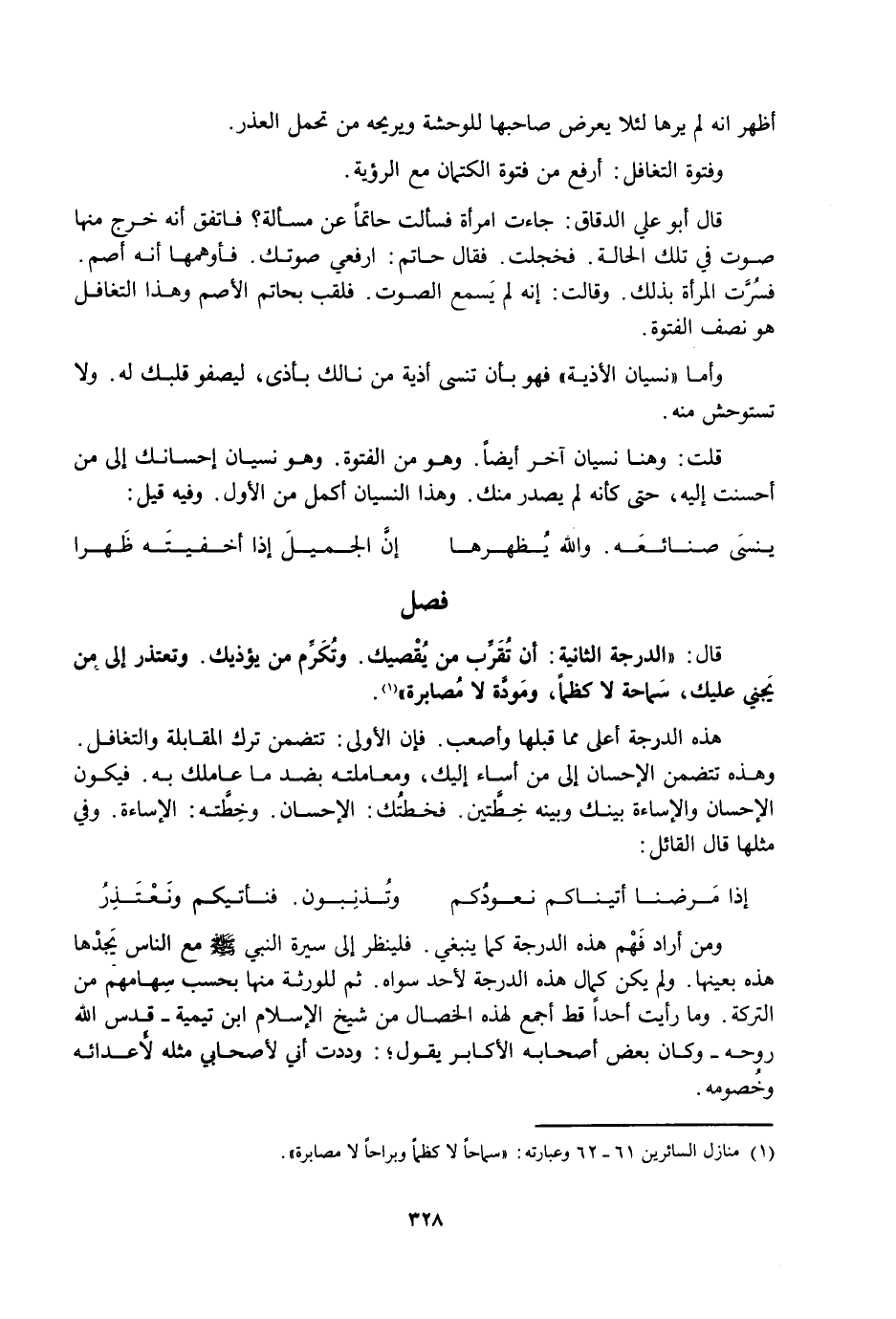 قُلْتُ: وَهُنَا نِسْيَانٌ آخَرُ أَيْضًا. وَهُوَ مِنَ الْفُتُوَّةِ. وَهُوَ نِسْيَانُ إِحْسَانِكَ إِلَى مَنْ أَحْسَنْتَ إِلَيْهِ، حَتَّى كَأَنَّهُ لَمْ يَصْدُرْ مِنْكَ. وَهَذَا النِّسْيَانُ أَكْمَلُ مِنَ الْأَوَّلِ. وَفِيهِ قِيلَ: