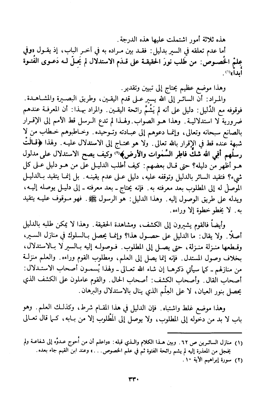 وَهَذَا مَوْضِعُ غَلَطٍ وَاشْتِبَاهٍ. فَإِنَّ الدَّلِيلَ فِي هَذَا الْمَقَامِ شَرْطٌ، وَكَذَلِكَ الْعِلْمُ. وَهُوَ بَابٌ لَا بُدَّ مِنْ دُخُولِهِ إِلَى الْمَطْلُوبِ، وَلَا يُوصَلُ إِلَى الْمَطْلُوبِ إِلَّا مِنْ بَابِهِ، كَمَا قَالَ تَعَالَى:
