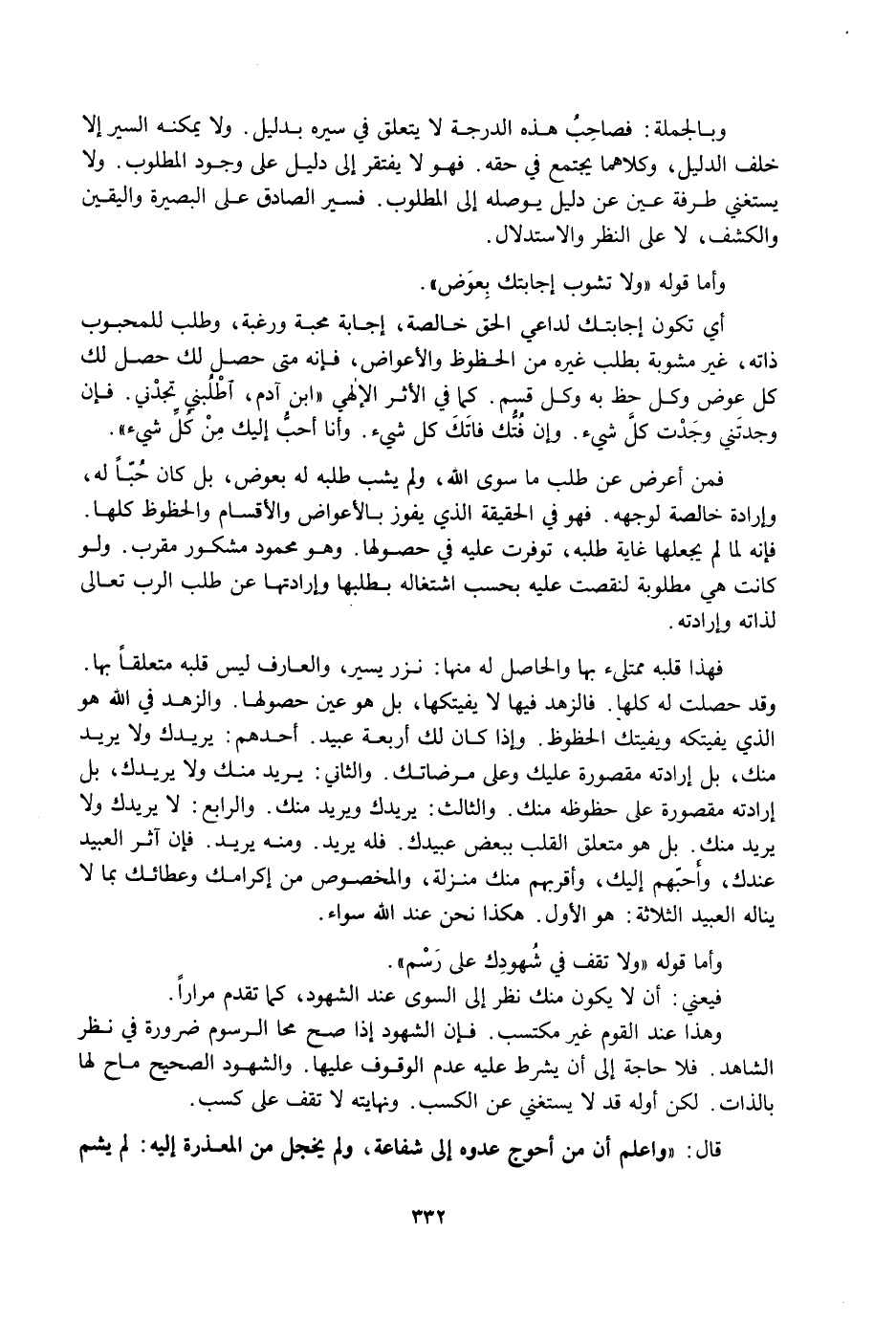 فَمَنْ أَعْرَضَ عَنْ طَلَبِ مَا سِوَى اللَّهِ، وَلَمْ يَشُبْ طَلَبَهُ لَهُ بِعِوَضٍ، بَلْ كَانَ حُبًّا لَهُ، وَإِرَادَةً خَالِصَةً لِوَجْهِهِ، فَهُوَ فِي الْحَقِيقَةِ الَّذِي يَفُوزُ بِالْأَعْوَاضِ وَالْأَقْسَامِ وَالْحُظُوظِ كُلِّهَا. فَإِنَّهُ لَمَّا لَمْ يَجْعَلْهَا غَايَةَ طَلَبِهِ، تَوَفَّرَتْ عَلَيْهِ فِي حُصُولِهَا. وَهُوَ مَحْمُودٌ مَشْكُورٌ مُقَرَّبٌ. وَلَوْ كَانَتْ هِيَ مَطْلُوبَةً لَنَقَصَتْ عَلَيْهِ بِحَسَبِ اشْتِغَالِهِ بِطَلَبِهَا وَإِرَادَتِهَا عَنْ طَلَبِ الرَّبِّ تَعَالَى لِذَاتِهِ وَإِرَادَتِهِ.