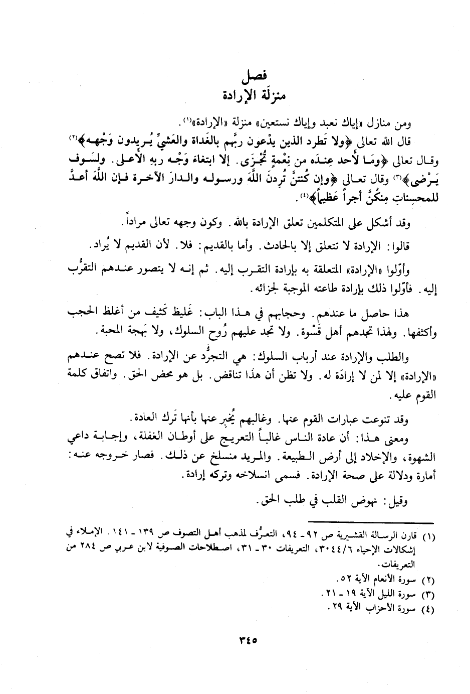 وَمِنْ مَنَازِلِ {إِيَّاكَ نَعْبُدُ وَإِيَّاكَ نَسْتَعِينُ} [الفاتحة: 5] مَنْزِلَةُ الْإِرَادَةِ