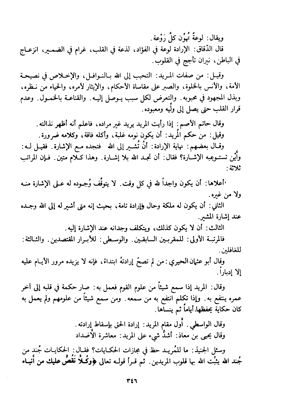 قَالَ الدَّقَّاقُ: الْإِرَادَةُ لَوْعَةٌ فِي الْفُؤَادِ، لَذْعَةٌ فِي الْقَلْبِ، غَرَامٌ فِي الضَّمِيرِ، انْزِعَاجٌ فِي الْبَاطِنِ، نِيرَانٌ تَأَجَّجُ فِي الْقُلُوبِ.