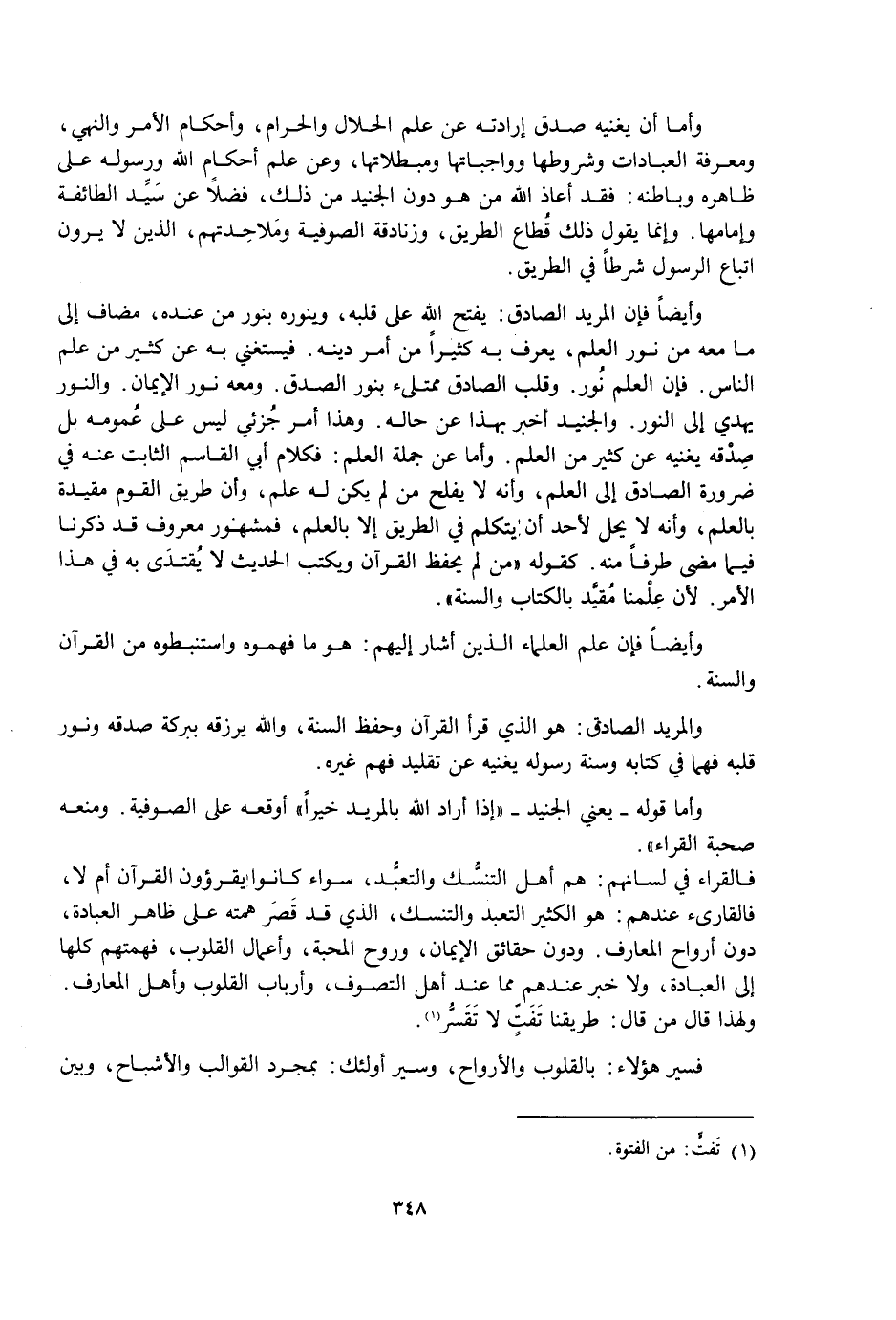 وَأَمَّا أَنْ يُغْنِيَهُ صِدْقُ إِرَادَتِهِ عَنْ عِلْمِ الْحَلَالِ وَالْحَرَامِ، وَأَحْكَامِ الْأَمْرِ وَالنَّهْيِ، وَمَعْرِفَةِ الْعِبَادَاتِ وَشُرُوطِهَا وَوَاجِبَاتِهَا وَمُبْطِلَاتِهَا، وَعَنْ عِلْمِ أَحْكَامِ اللَّهِ وَرَسُولِهِ عَلَى ظَاهِرِهِ وَبَاطِنِهِ: فَقَدْ أَعَاذَ اللَّهُ مَنْ هُوَ دُونَ الْجُنَيْدِ مِنْ ذَلِكَ، فَضْلًا عَنْ سَيِّدِ الطَّائِفَةِ وَإِمَامِهَا، وَإِنَّمَا يَقُولُ ذَلِكَ قُطَّاعُ الطَّرِيقِ، وَزَنَادِقَةُ الصُّوفِيَّةِ وَمَلَاحِدَتُهُمْ، الَّذِينَ لَا يَرَوْنَ اتِّبَاعَ الرَّسُولِ شَرْطًا فِي الطَّرِيقِ.