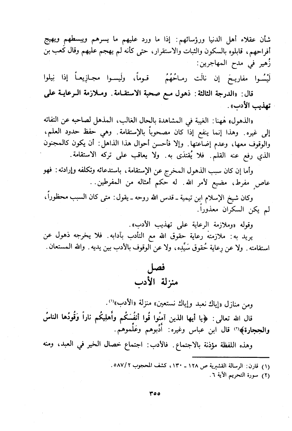 وَمِنْ مَنَازِلِ {إِيَّاكَ نَعْبُدُ وَإِيَّاكَ نَسْتَعِينُ} [الفاتحة: 5] مَنْزِلَةُ الْأَدَبِ