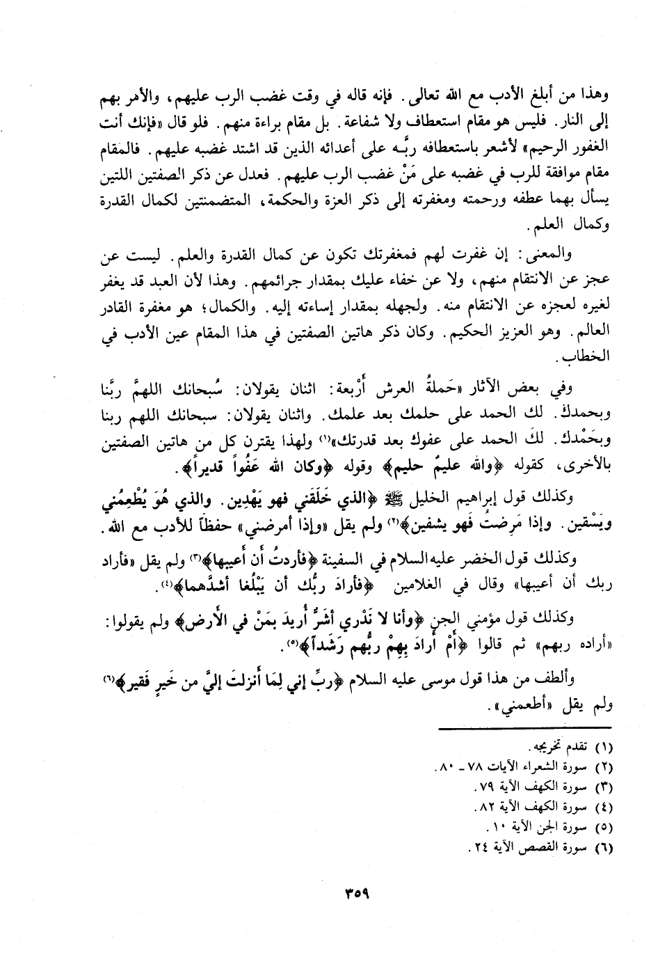وَكَذَلِكَ قَوْلُ إِبْرَاهِيمَ الْخَلِيلِ صَلَّى اللَّهُ عَلَيْهِ وَسَلَّمَ: {الَّذِي خَلَقَنِي فَهُوَ يَهْدِينِ وَالَّذِي هُوَ يُطْعِمُنِي وَيَسْقِينِ وَإِذَا مَرِضْتُ فَهُوَ يَشْفِينِ} [الشعراء: 78] وَلَمْ يَقُلْ: وَإِذَا أَمْرَضَنِي. حِفْظًا لِلْأَدَبِ مَعَ اللَّهِ.