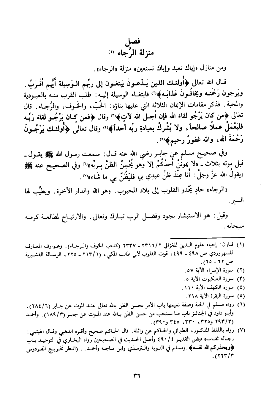 وَمِنْ مَنَازِلِ: {إِيَّاكَ نَعْبُدُ وَإِيَّاكَ نَسْتَعِينُ} [الفاتحة: 5] مَنْزِلَةُ الرَّجَاءِ.