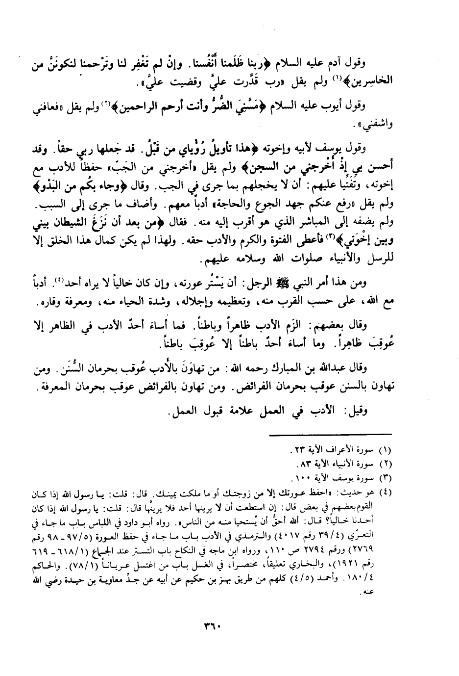 وَقَالَ عَبْدُ اللَّهِ بْنُ الْمُبَارَكِ رَحِمَهُ اللَّهُ: مَنْ تَهَاوَنَ بِالْأَدَبِ عُوقِبَ بِحِرْمَانِ السُّنَنِ. وَمَنْ تَهَاوَنَ بِالسُّنَنِ. عُوقِبَ بِحِرْمَانِ الْفَرَائِضِ. وَمَنْ تَهَاوَنَ بِالْفَرَائِضِ عُوقِبَ بِحِرْمَانِ الْمَعْرِفَةِ.