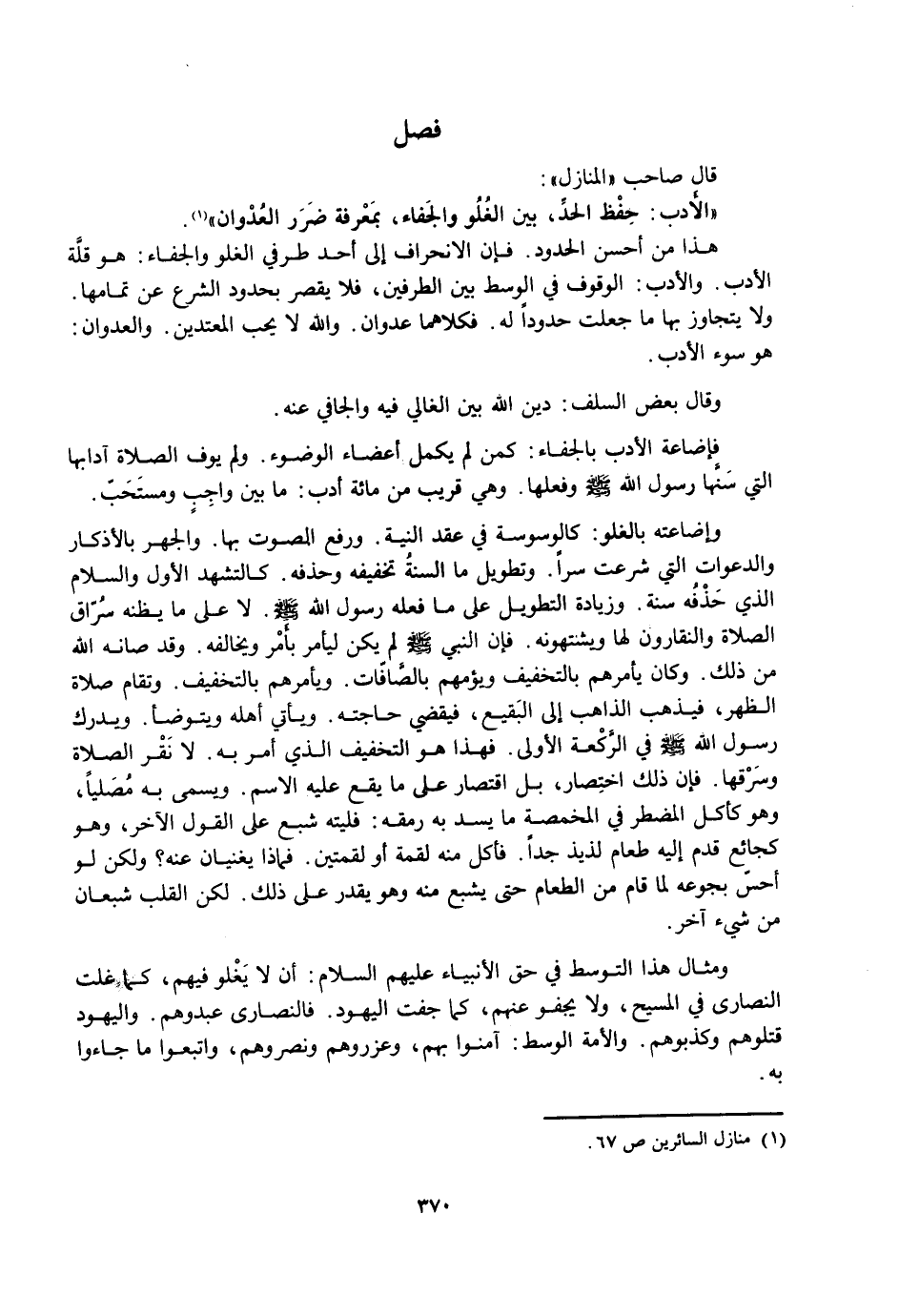 هَذَا مِنْ أَحْسَنِ الْحُدُودِ. فَإِنَّ الِانْحِرَافَ إِلَى أَحَدِ طَرَفَيِ الْغُلُوِّ وَالْجَفَاءِ: هُوَ قِلَّةُ الْأَدَبِ. وَالْأَدَبُ: الْوُقُوفُ فِي الْوَسَطِ بَيْنَ الطَّرَفَيْنِ، فَلَا يُقَصِّرُ بِحُدُودِ الشَّرْعِ عَنْ تَمَامِهَا. وَلَا يَتَجَاوَزُ بِهَا مَا جُعِلَتْ حُدُودًا لَهُ. فَكِلَاهُمَا عُدْوَانٌ. وَاللَّهُ لَا يُحِبُّ الْمُعْتَدِينَ. وَالْعُدْوَانُ: هُوَ سُوءُ الْأَدَبِ.