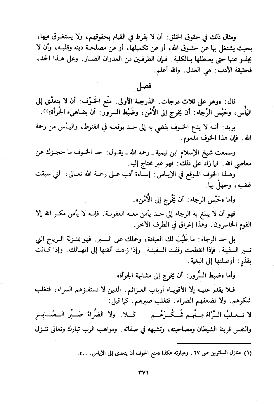قَالَ: وَهُوَ عَلَى ثَلَاثِ دَرَجَاتٍ. الدَّرَجَةُ الْأُولَى: مَنْعُ الْخَوْفِ: أَنْ لَا يَتَعَدَّى إِلَى الْيَأْسِ، وَحَبْسُ الرَّجَاءِ: أَنْ يَخْرُجَ إِلَى الْأَمْنِ، وَضَبْطُ السُّرُورِ: أَنْ يُضَاهِئَ الْجُرْأَةَ.