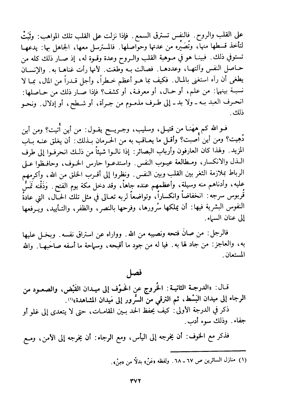 عَلَى الْقَلْبِ وَالرُّوحِ. فَالنَّفْسُ تَسْتَرِقُ السَّمْعَ. فَإِذَا نَزَلَتْ عَلَى الْقَلْبِ تِلْكَ الْمَوَاهِبُ: وَثَبَتْ لِتَأْخُذَ قِسْطَهَا مِنْهَا، وَتُصَيِّرَهُ مِنْ عِدَّتِهَا وَحَوَاصِلِهَا. فَالْمُسْتَرْسِلُ مَعَهَا، الْجَاهِلُ بِهَا فَيَدَعُهَا تَسْتَوْفِي ذَلِكَ. فَبَيْنَا هُوَ فِي مَوْهِبَةِ الْقَلْبِ وَالرُّوحِ وَعِدَّةٍ وَقُوَّةٍ لَهُ، إِذْ صَارَ ذَلِكَ كُلُّهُ مِنْ حَاصِلِ النَّفْسِ وَآلَتِهَا، وَعُدَدِهَا. فَصَالَتْ بِهِ وَطَغَتْ. لِأَنَّهَا رَأَتْ غِنَاهَا بِهِ. وَالْإِنْسَانُ يَطْغَى أَنْ رَآهُ اسْتَغْنَى بِالْمَالِ. فَكَيْفَ بِمَا هُوَ أَعْظَمُ خَطَرًا، وَأَجَلُّ قَدْرًا مِنَ الْمَالِ، بِمَا لَا نِسْبَةَ بَيْنَهُمَا: مَنْ عِلْمٍ، أَوْ حَالٍ، أَوْ مَعْرِفَةٍ، أَوْ كَشْفٍ؟ فَإِذَا صَارَ ذَلِكَ مِنْ حَاصِلِهَا: انْحَرَفَ الْعَبْدُ بِهِ وَلَا بُدَّ إِلَى طَرَفٍ مَذْمُومٍ مِنْ جُرْأَةٍ، أَوْ شَطْحٍ، أَوْ إِدْلَالٍ. وَنَحْوِ ذَلِكَ.