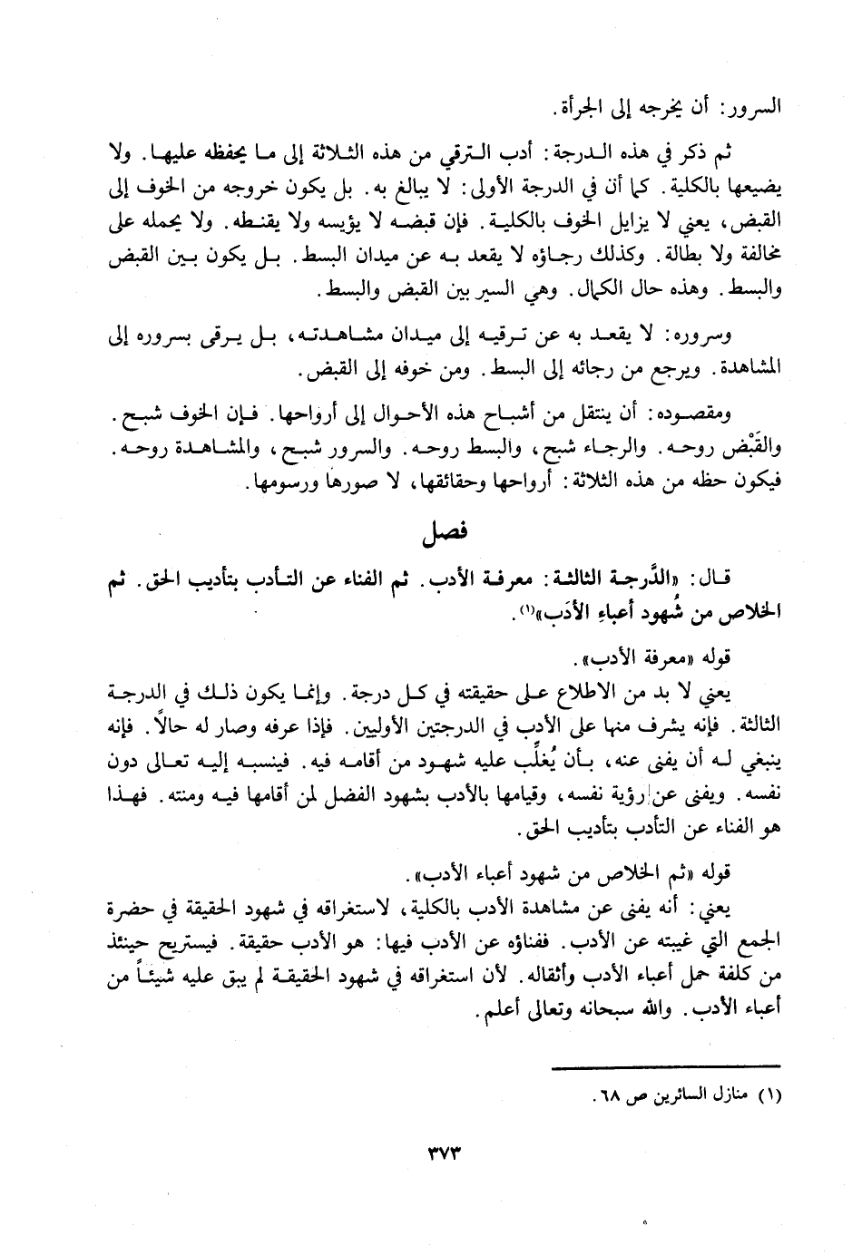 يَعْنِي لَا بُدَّ مِنْ الِاطِّلَاعِ عَلَى حَقِيقَتِهِ فِي كُلِّ دَرَجَةٍ. وَإِنَّمَا يَكُونُ ذَلِكَ فِي الدَّرَجَةِ الثَّالِثَةِ. فَإِنَّهُ يُشْرِفُ مِنْهَا عَلَى الْأَدَبِ فِي الدَّرَجَتَيْنِ الْأُولَيَيْنِ. فَإِذَا عَرَفَهُ وَصَارَ لَهُ حَالًا. فَإِنَّهُ يَنْبَغِي لَهُ أَنْ يَفْنَى عَنْهُ، بِأَنْ يَغْلِبَ عَلَيْهِ شُهُودُ مَنْ أَقَامَهُ فِيهِ. فَيَنْسِبَهُ إِلَيْهِ تَعَالَى دُونَ نَفْسِهِ. وَيَفْنَى عَنْ رُؤْيَةِ نَفْسِهِ، وَقِيَامِهَا بِالْأَدَبِ بِشُهُودِ الْفَضْلِ لِمَنْ أَقَامَهَا فِيهِ وَمِنَّتِهِ. فَهَذَا هُوَ الْفَنَاءُ عَنِ التَّأَدُّبِ بِتَأْدِيبِ الْحَقِّ.