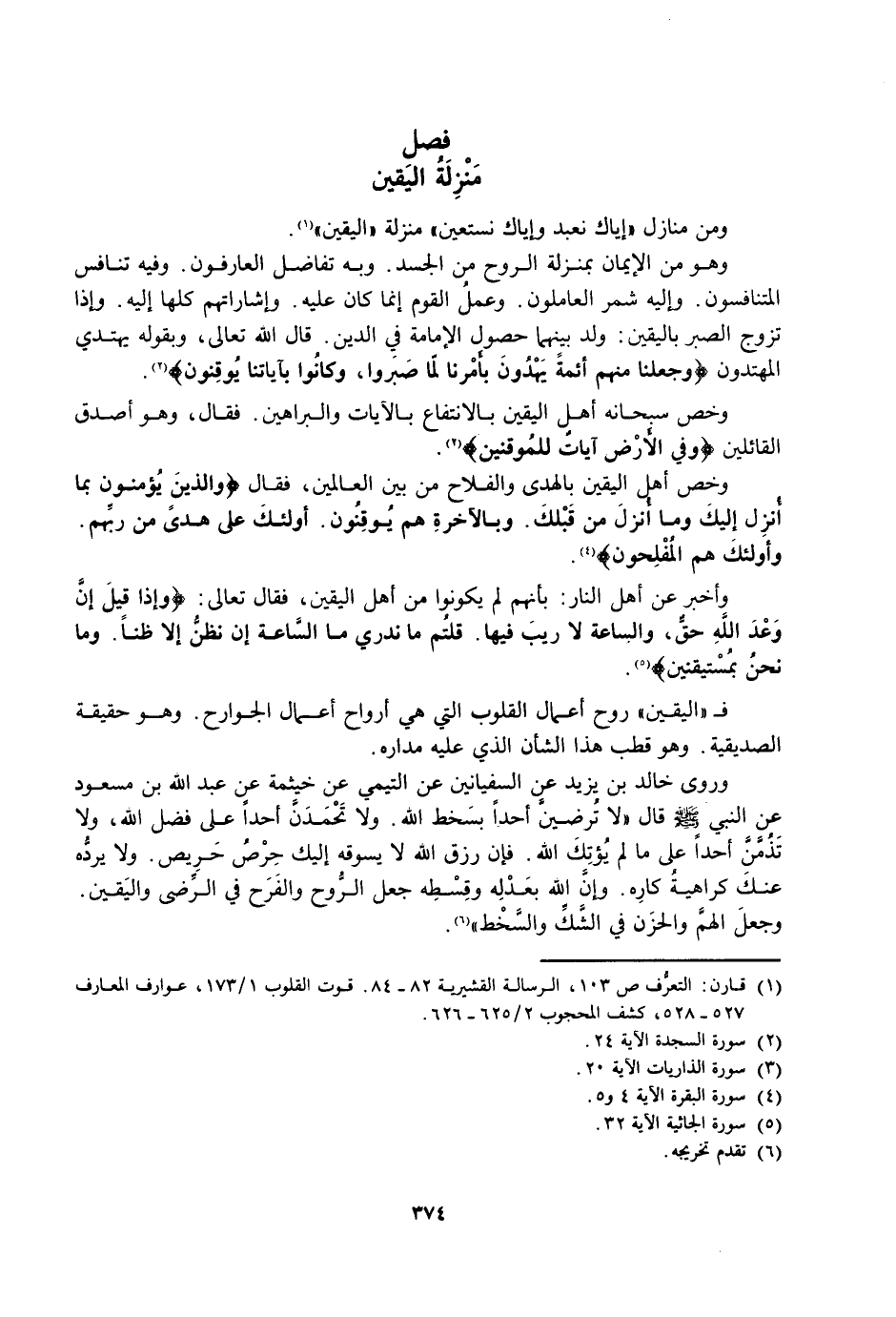 وَمِنْ مَنَازِلِ {إِيَّاكَ نَعْبُدُ وَإِيَّاكَ نَسْتَعِينُ} [الفاتحة: 5] مَنْزِلَةُ الْيَقِينِ