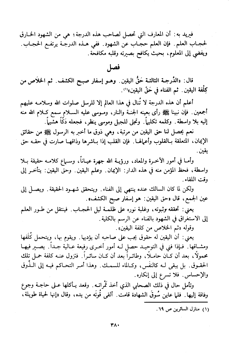 وَلَكِنْ لَمَّا كَانَ السَّالِكُ عِنْدَهُ يَنْتَهِي إِلَى الْفَنَاءِ. وَيَتَحَقَّقُ شُهُودَ الْحَقِيقَةِ. وَيَصِلُ إِلَى عَيْنِ الْجَمْعِ، قَالَ: حَقُّ الْيَقِينِ: هُوَ إِسْفَارُ صُبْحِ الْكَشْفِ.
