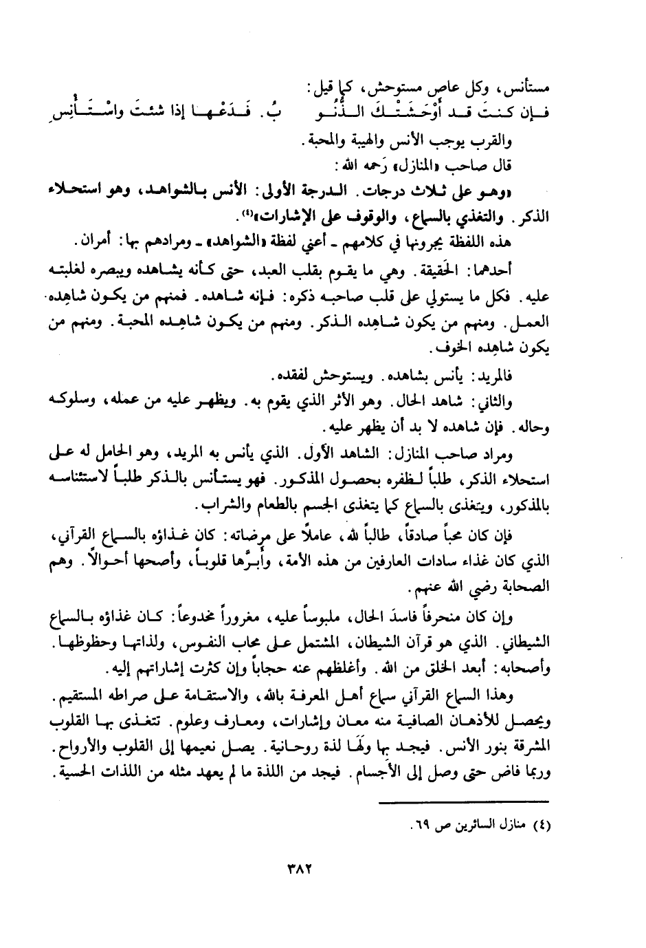 وَمُرَادُ صَاحِبِ " الْمَنَازِلِ ": الشَّاهِدُ الْأَوَّلِ. الَّذِي يَأْنَسُ بِهِ الْمُرِيدُ، وَهُوَ الْحَامِلُ لَهُ عَلَى اسْتِحْلَاءِ الذِّكْرِ، طَلَبًا لِظَفَرِهِ بِحُصُولِ الْمَذْكُورِ. فَهُوَ يَسْتَأْنِسُ بِالذِّكْرِ طَلَبًا لِاسْتِئْنَاسِهِ بِالْمَذْكُورِ، وَيَتَغَذَّى بِالسَّمَاعِ كَمَا يَتَغَذَّى الْجِسْمُ بِالطَّعَامِ وَالشَّرَابِ.