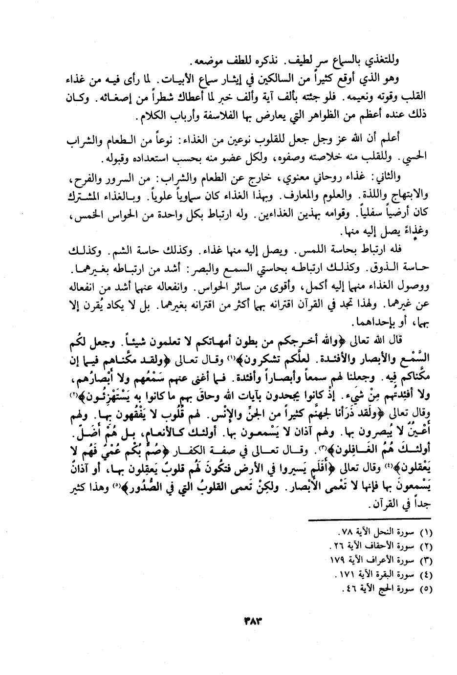 اعْلَمْ أَنَّ اللَّهَ عَزَّ وَجَلَّ جَعَلَ لِلْقُلُوبِ نَوْعَيْنِ مِنَ الْغِذَاءِ: نَوْعًا مِنَ الطَّعَامِ وَالشَّرَابِ الْحِسِّيِّ. وَلِلْقَلْبِ مِنْهُ خُلَاصَتُهُ وَصَفْوُهُ، وَلِكُلِّ عُضْوٍ مِنْهُ بِحَسَبِ اسْتِعْدَادِهِ وَقَبُولِهِ.