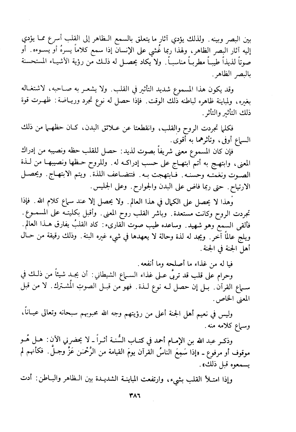 بَيْنَ الْبَصَرِ وَبَيْنَهُ. وَلِذَلِكَ يُؤَدِّي آثَارُ مَا يَتَعَلَّقُ بِالسَّمْعِ الظَّاهِرِ إِلَى الْقَلْبِ أَسْرَعَ مِمَّا يُؤَدِّي إِلَيْهِ آثَارُ الْبَصَرِ الظَّاهِرِ، وَلِهَذَا رُبَّمَا غُشِيَ عَلَى الْإِنْسَانِ إِذَا سَمِعَ كَلَامًا يَسُرُّهُ أَوْ يَسُوءُهُ. أَوْ صَوْتًا لَذِيذًا طَيِّبًا مُطْرِبًا مُنَاسِبًا. وَلَا يَكَادُ يَحْصُلُ لَهُ ذَلِكَ مِنْ رُؤْيَةِ الْأَشْيَاءِ الْمُسْتَحْسَنَةِ بِالْبَصَرِ الظَّاهِرِ.