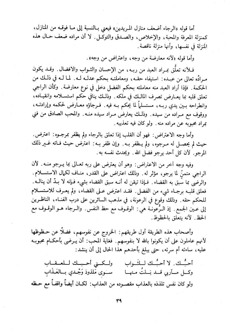 وَفِيهِ وَجْهٌ آخَرُ مِنَ الِاعْتِرَاضِ: وَهُوَ أَنْ يَعْتَرِضَ عَلَى رَبِّهِ تَعَالَى بِمَا يَرْجُو مِنْهُ؛ لِأَنَّ الرَّاجِيَ مُتَمَنٍّ لِمَا يَرْجُو، مُؤْثِرٌ لَهُ. وَذَلِكَ اعْتِرَاضٌ عَلَى الْقَدَرِ، مُنَافٍ لِكَمَالِ الِاسْتِسْلَامِ وَالرِّضَا بِمَا سَبَقَ بِهِ الْقَضَاءُ. فَإِذَا تَيَقَّنَ لَهُ أَنَّهُ سَبَقَ الْقَضَاءَ بِشَيْءٍ فَإِنَّهُ لَا بُدَّ أَنْ يَنَالَهُ. فَعَلَّقَ قَلْبَهُ بِرَجَاءِ شَيْءٍ مِنَ الْفَضْلِ. فَقَدِ اعْتَرَضَ عَلَى الْقَضَاءِ، وَلَمْ يَعْرِفْ لِلِاسْتِسْلَامِ لِلْحُكْمِ حَقَّهُ. وَذَلِكَ وُقُوعٌ فِي الرُّعُونَةِ. فِي مَذْهَبِ السَّائِرِينَ عَلَى دَرْبِ الْفَنَاءِ، النَّاظِرِينَ إِلَى عَيْنِ الْجَمْعِ. إِذِ الرُّعُونَةُ هِيَ الْوُقُوفُ مَعَ حَظِّ النَّفْسِ. وَالرَّجَاءُ هُوَ الْوُقُوفُ مَعَ الْحَظِّ؛ لِأَنَّهُ يَتَعَلَّقُ بِالْحُظُوظِ.