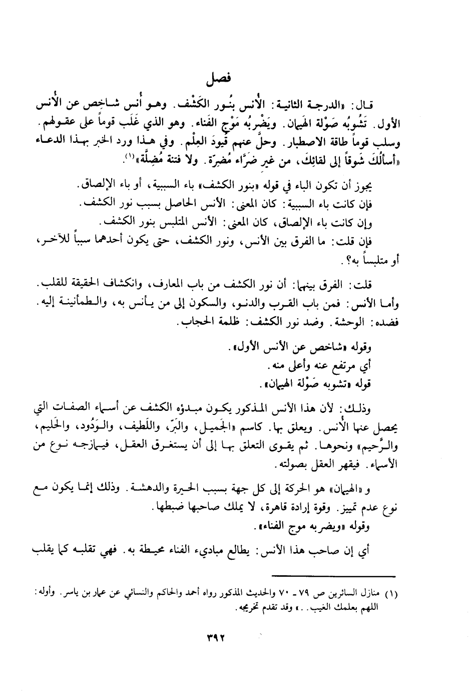 قَالَ: الدَّرَجَةُ الثَّانِيَةُ: الْأُنْسُ بِنُورِ الْكَشْفِ. وَهُوَ أَنَسٌ شَاخِصٌ عَنِ الْأُنْسِ الْأَوَّلِ. تَشُوبُهُ صَوْلَةُ الْهَيْمَانِ. وَيَضْرِبُهُ مَوْجُ الْفَنَاءِ. وَهُوَ الَّذِي غَلَبَ قَوْمًا عَلَى عُقُولِهِمْ وَسَلَبَ قَوْمًا طَاقَةَ الِاصْطِبَارِ. وَحَلَّ عَنْهُمْ قُيُودَ الْعِلْمِ. وَفِي هَذَا وَرَدَ الْخَبَرُ بِهَذَا الدُّعَاءِ: «أَسْأَلُكُ شَوْقًا إِلَى لِقَائِكَ، مِنْ غَيْرِ ضَرَّاءَ مُضِرَّةٍ. وَلَا فِتْنَةٍ مُضِلَّةٍ» .