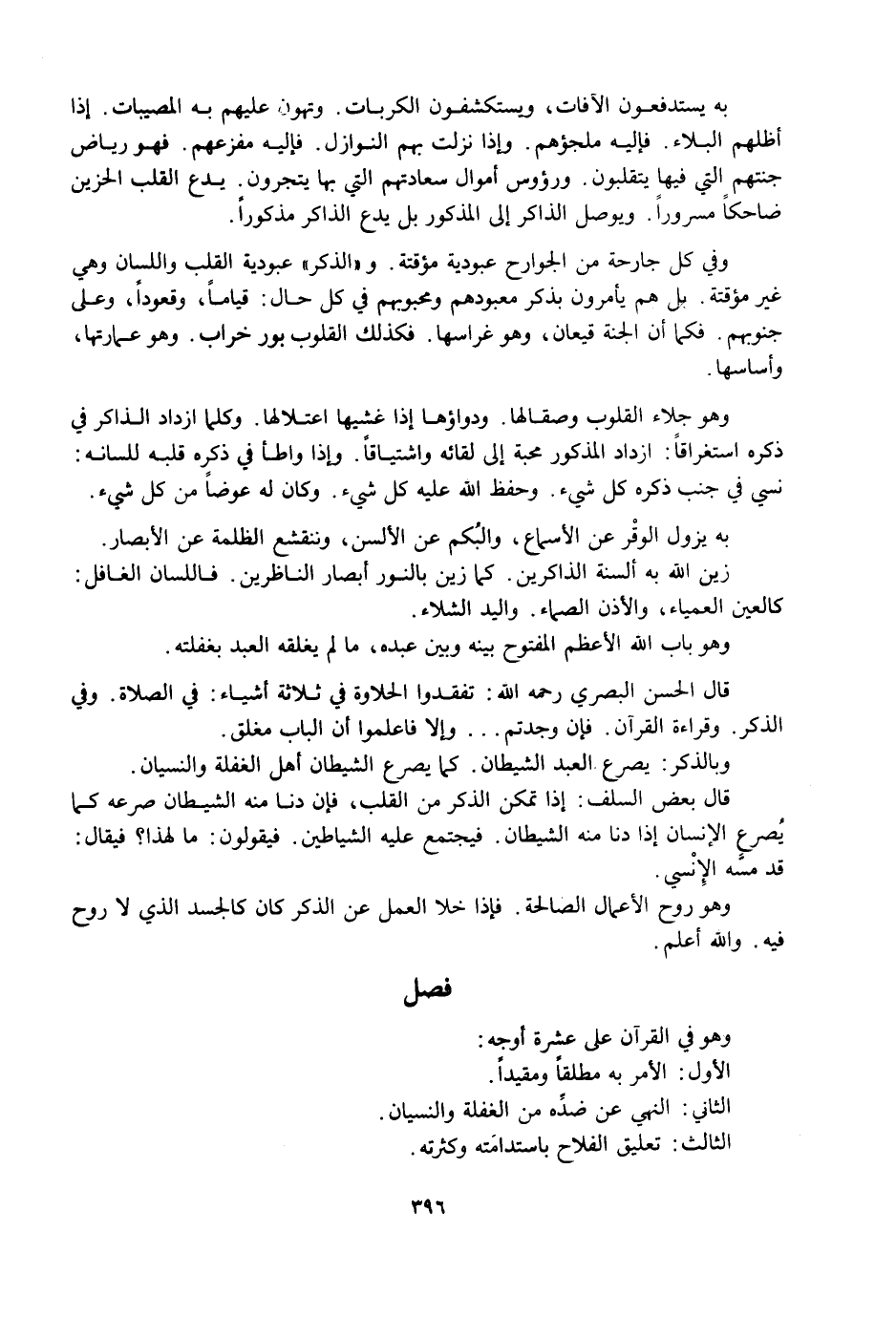 وَهُوَ جَلَاءُ الْقُلُوبِ وَصِقَالُهَا وَدَوَاؤُهَا إِذَا غَشِيَهَا اعْتِلَالُهَا، وَكُلَّمَا ازْدَادَ الذَّاكِرُ فِي ذِكْرِهِ اسْتِغْرَاقًا: ازْدَادَ الْمَذْكُورُ مَحَبَّةً إِلَى لِقَائِهِ وَاشْتِيَاقًا، وَإِذَا وَاطَأَ فِي ذِكْرِهِ قَلْبُهُ لِلِسَانِهِ: نَسِيَ فِي جَنْبِ ذِكْرِهِ كُلَّ شَيْءٍ وَحَفِظَ اللَّهُ عَلَيْهِ كُلَّ شَيْءٍ وَكَانَ لَهُ عِوَضًا مِنْ كُلِّ شَيْءٍ.