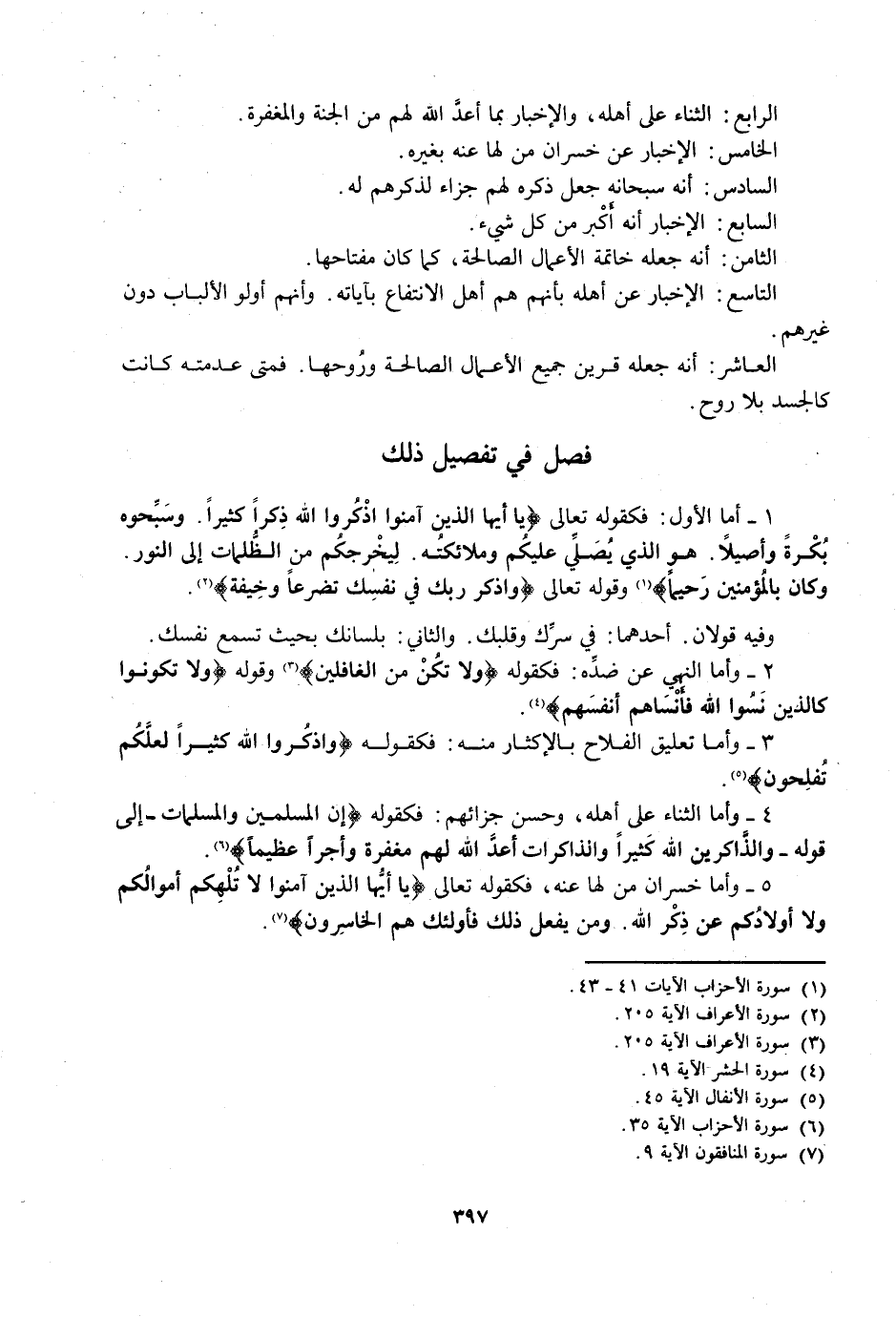 فَصْلٌ فِي تَفْصِيلِ ذَلِكَ 1 - أَمَّا الْأَوَّلُ: فَكَقَوْلِهِ تَعَالَى: {يَاأَيُّهَا الَّذِينَ آمَنُوا اذْكُرُوا اللَّهَ ذِكْرًا كَثِيرًا - وَسَبِّحُوهُ بُكْرَةً وَأَصِيلًا - هُوَ الَّذِي يُصَلِّي عَلَيْكُمْ وَمَلَائِكَتُهُ لِيُخْرِجَكُمْ مِنَ الظُّلُمَاتِ إِلَى النُّورِ وَكَانَ بِالْمُؤْمِنِينَ رَحِيمًا} [الأحزاب: 41 - 43] وَقَوْلِهِ تَعَالَى: {وَاذْكُرْ رَبَّكَ فِي نَفْسِكَ تَضَرُّعًا وَخِيفَةً} [الأعراف: 205] .