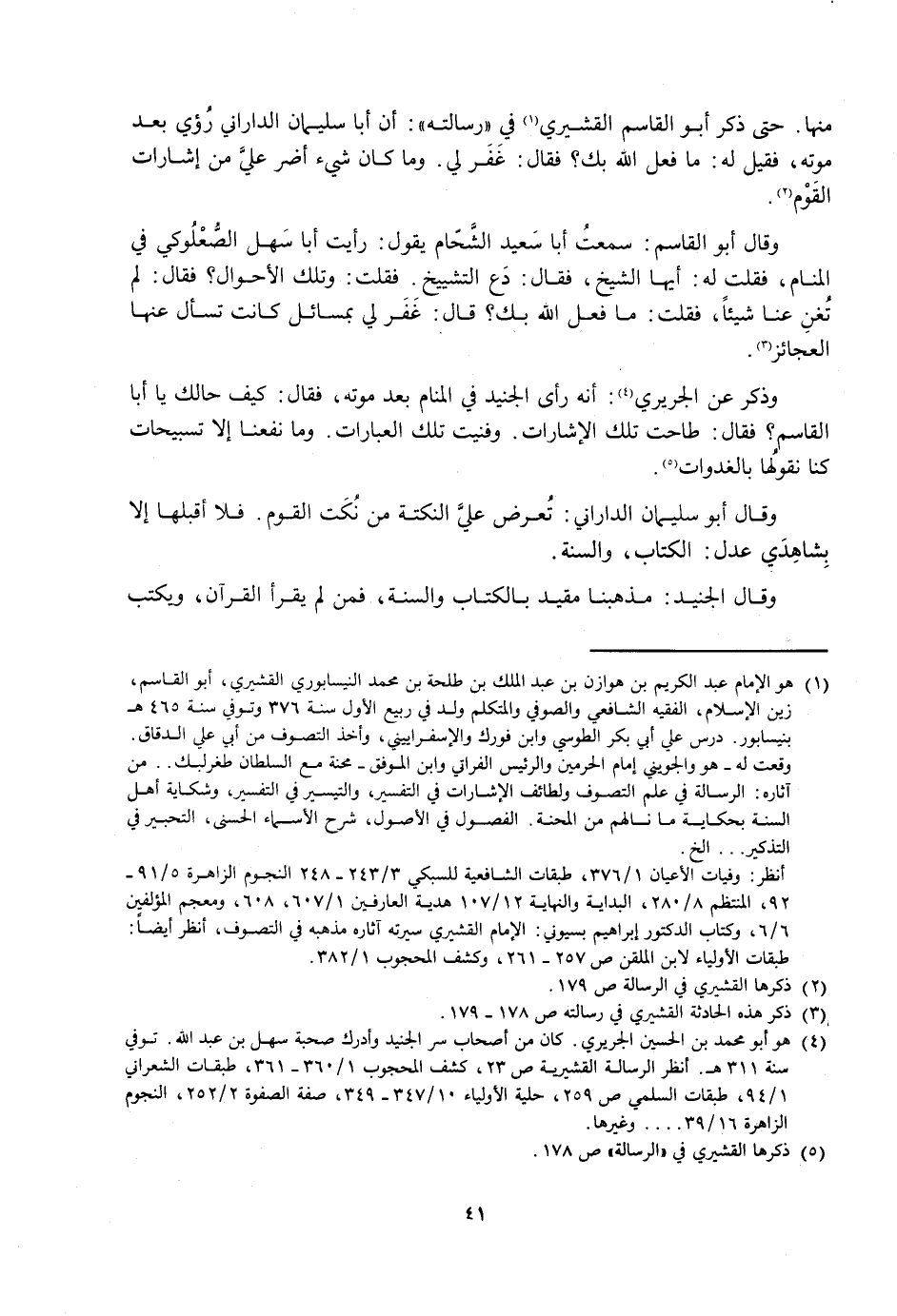 مِنْهَا حَتَّى ذَكَرَ أَبُو الْقَاسِمِ الْقُشَيْرِيُّ فِي رِسَالَتِهِ أَنَّ أَبَا سُلَيْمَانَ الدَّارَانِيَّ رُؤِيَ بَعْدَ مَوْتِهِ، فَقِيلَ لَهُ: مَا فَعَلَ اللَّهُ بِكَ؟ فَقَالَ: غَفَرَ لِي. وَمَا كَانَ شَيْءٌ أَضَرُّ عَلَيَّ مِنْ إِشَارَاتِ الْقَوْمِ.