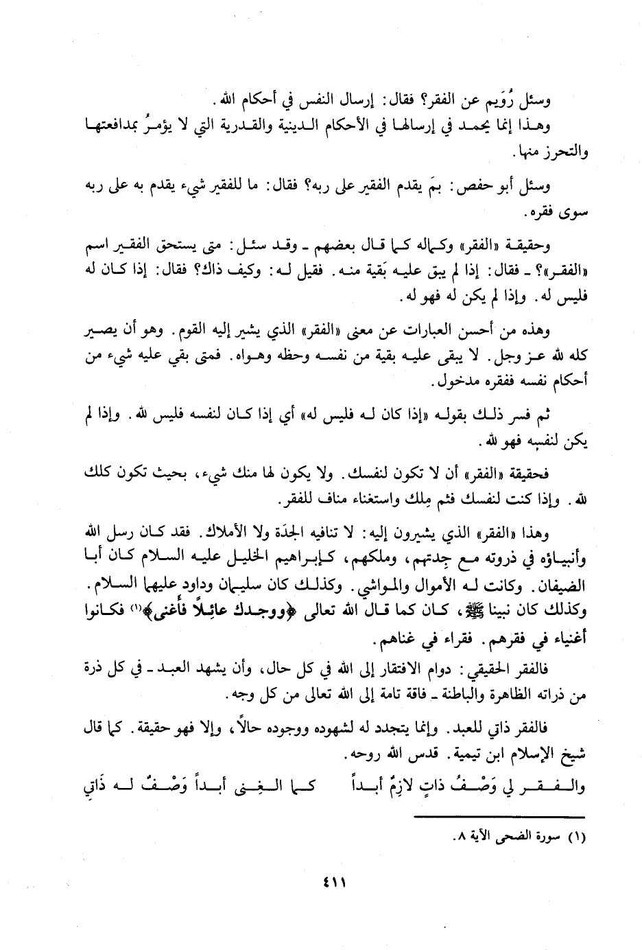 وَهَذِهِ مِنْ أَحْسَنِ الْعِبَارَاتِ عَنْ مَعْنَى الْفَقْرِ الَّذِي يُشِيرُ إِلَيْهِ الْقَوْمُ. وَهُوَ أَنَّ كُلَّهُ يَصِيرُ لِلَّهِ عَزَّ وَجَلَّ. لَا يَبْقَى عَلَيْهِ بَقِيَّةٌ مِنْ نَفْسِهِ وَحَظِّهِ وَهَوَاهُ. فَمَتَى بَقِيَ عَلَيْهِ شَيْءٌ مِنْ أَحْكَامِ نَفْسِهِ فَفَقْرُهُ مَدْخُولٌ.