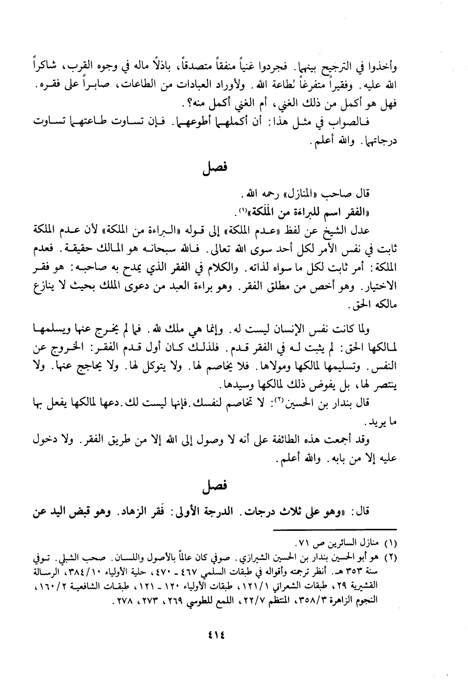 عَدَلَ الشَّيْخُ عَنْ لَفْظِ عَدَمِ الْمَلَكَةِ إِلَى قَوْلِهِ: الْبَرَاءَةُ مِنَ الْمَلَكَةِ لِأَنَّ عَدَمَ الْمَلَكَةِ ثَابِتٌ فِي نَفْسِ الْأَمْرِ لِكُلِّ أَحَدٍ سِوَى اللَّهِ تَعَالَى. فَاللَّهُ سُبْحَانَهُ هُوَ الْمَالِكُ حَقِيقَةً. فَعَدَمُ الْمَلَكَةِ: أَمْرٌ ثَابِتٌ لِكُلِّ مَا سِوَاهُ لِذَاتِهِ. وَالْكَلَامُ فِي الْفَقْرِ الَّذِي يُمْدَحُ بِهِ صَاحِبُهُ: هُوَ فَقْرُ الِاخْتِيَارِ. وَهُوَ أَخَصُّ مِنْ مُطْلَقِ الْفَقْرِ. وَهُوَ بَرَاءَةُ الْعَبْدِ مِنْ دَعْوَى الْمِلْكِ بِحَيْثُ لَا يُنَازِعُ مَالِكَهُ الْحَقَّ.