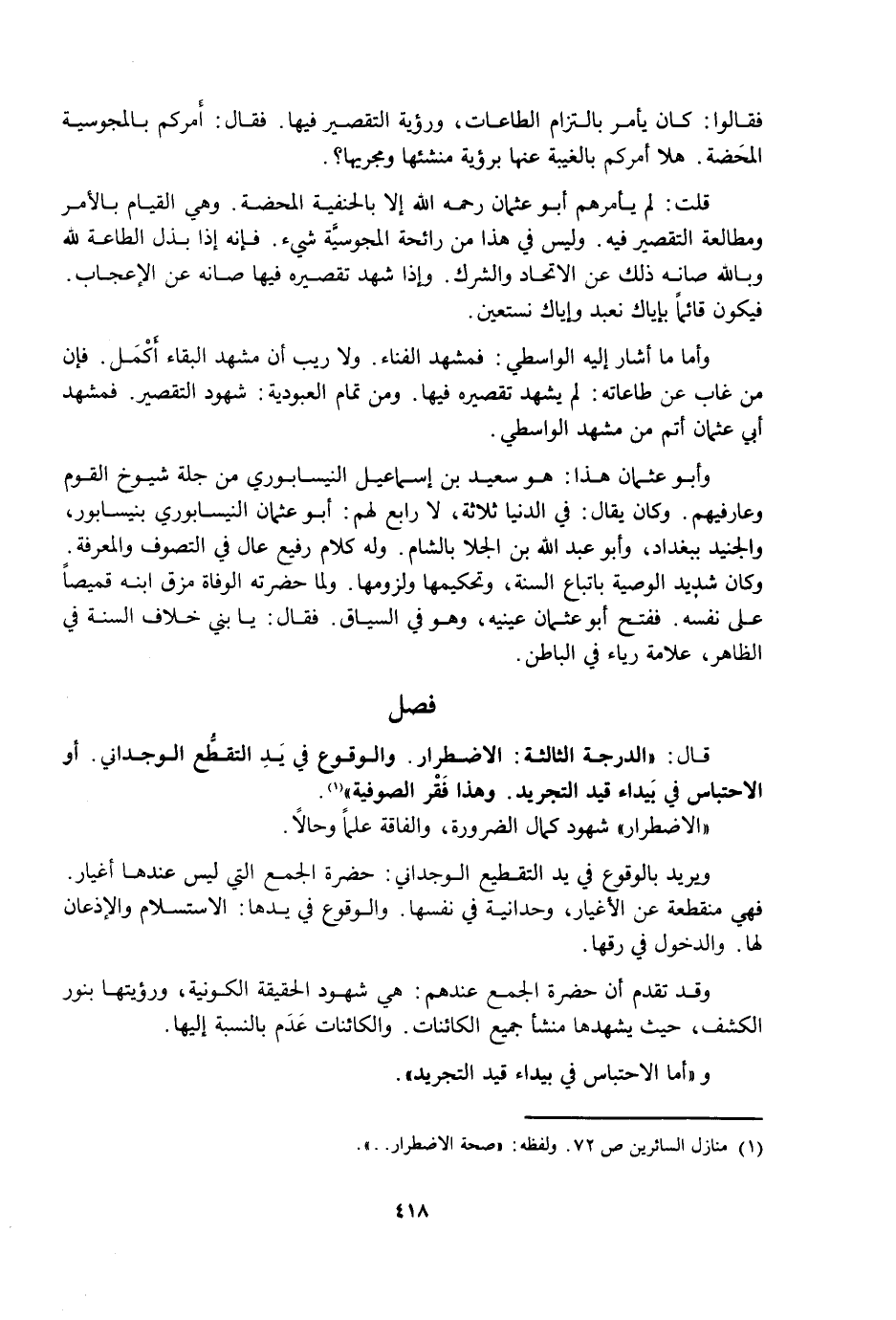 قَالَ الدَّرَجَةُ الثَّالِثَةُ: الِاضْطِرَارُ. وَالْوُقُوعُ فِي يَدِ التَّقَطُّعِ الْوِجْدَانِيِّ. أَوْ الِاحْتِبَاسُ فِي بَيْدَاءِ قَيْدِ التَّجْرِيدِ. وَهَذَا فَقْرُ الصُّوفِيَّةِ.