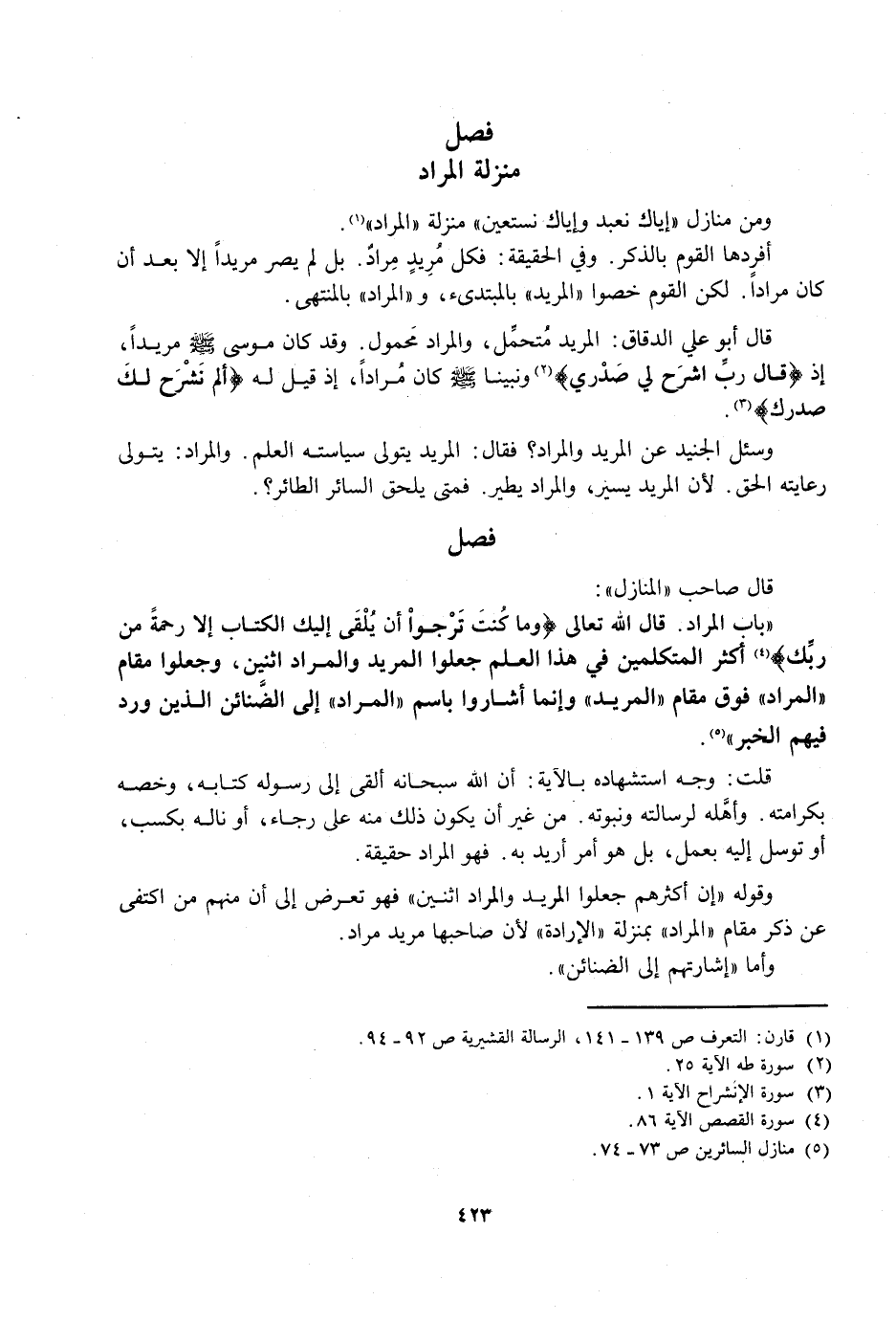 وَمِنْ مَنَازِلِ {إِيَّاكَ نَعْبُدُ وَإِيَّاكَ نَسْتَعِينُ} [الفاتحة: 5] مَنْزِلَةُ الْمُرَادِ.