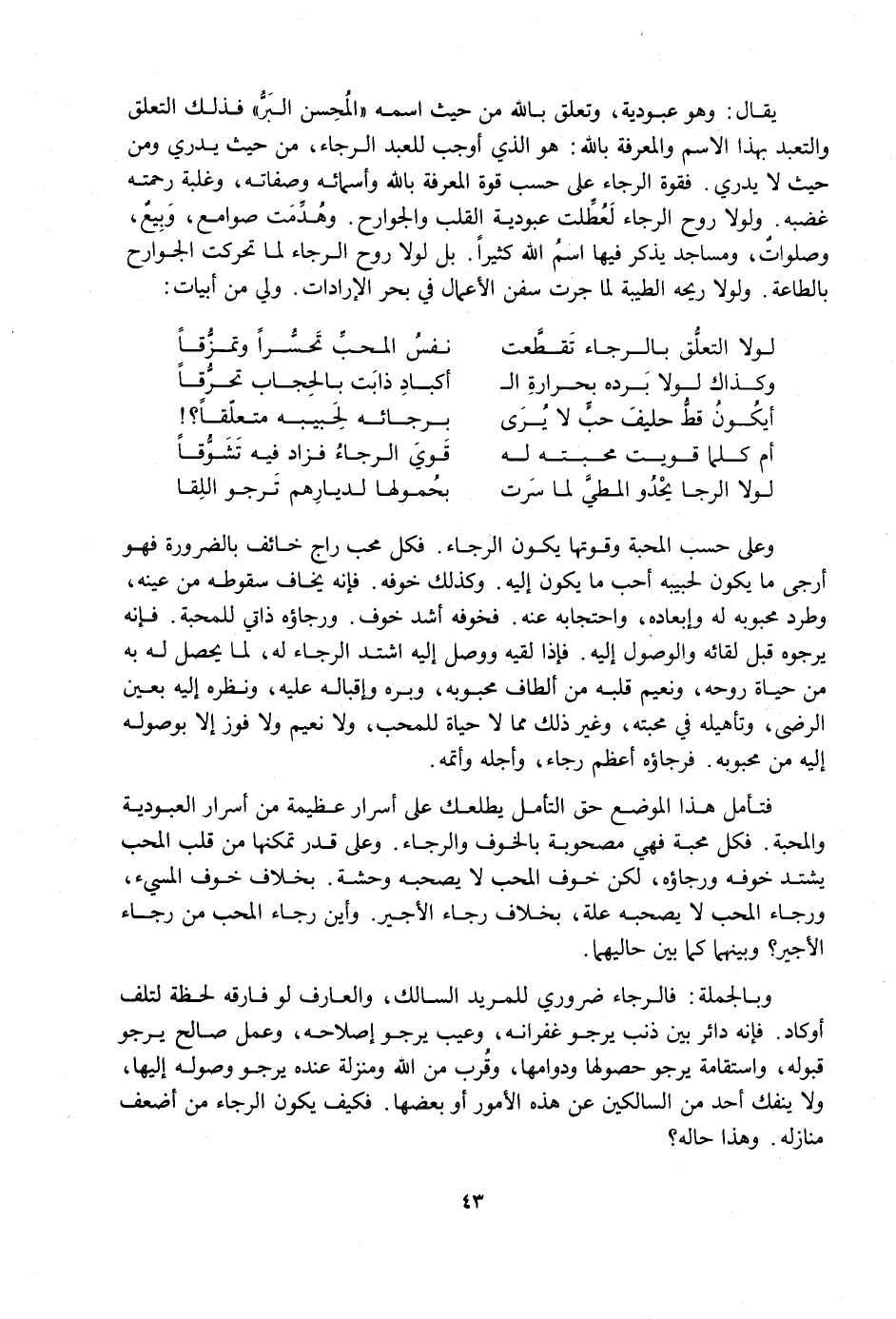 وَعَلَى حَسَبِ الْمَحَبَّةِ وَقُوَّتِهَا يَكُونُ الرَّجَاءُ. فَكُلُّ مُحِبٍّ رَاجٍ خَائِفٌ بِالضَّرُورَةِ فَهُوَ أَرْجَى مَا يَكُونُ لِحَبِيبِهِ، أَحَبُّ مَا يَكُونُ إِلَيْهِ. وَكَذَلِكَ خَوْفُهُ. فَإِنَّهُ يَخَافُ سُقُوطَهُ مِنْ عَيْنَيْهِ. وَطَرْدَ مَحْبُوبِهِ لَهُ وَإِبْعَادَهُ. وَاحْتِجَابَهُ عَنْهُ. فَخَوْفُهُ أَشَدُّ خَوْفٍ. وَرَجَاؤُهُ ذَاتِيٌّ لِلْمَحَبَّةِ. فَإِنَّهُ يَرْجُوهُ قَبْلَ لِقَائِهِ وَالْوُصُولِ إِلَيْهِ. فَإِذَا لَقِيَهُ وَوَصَلَ إِلَيْهِ اشْتَدَّ الرَّجَاءُ لَهُ، لِمَا يَحْصُلُ لَهُ بِهِ مِنْ حَيَاةِ رُوحِهِ، وَنَعِيمِ قَلْبِهِ مِنْ أَلْطَافِ مَحْبُوبِهِ، وَبِرِّهِ وَإِقْبَالِهِ عَلَيْهِ، وَنَظَرِهِ إِلَيْهِ بِعَيْنِ الرِّضَا، وَتَأْهِيلِهِ فِي مَحَبَّتِهِ، وَغَيْرِ ذَلِكَ مِمَّا لَا حَيَاةَ لِلْمُحِبِّ، وَلَا نَعِيمَ وَلَا فَوْزَ إِلَّا بِوُصُولِهِ إِلَيْهِ مِنْ مَحْبُوبِهِ. فَرَجَاؤُهُ أَعْظَمُ رَجَاءٍ، وَأَجَلُّهُ وَأَتَمُّهُ.