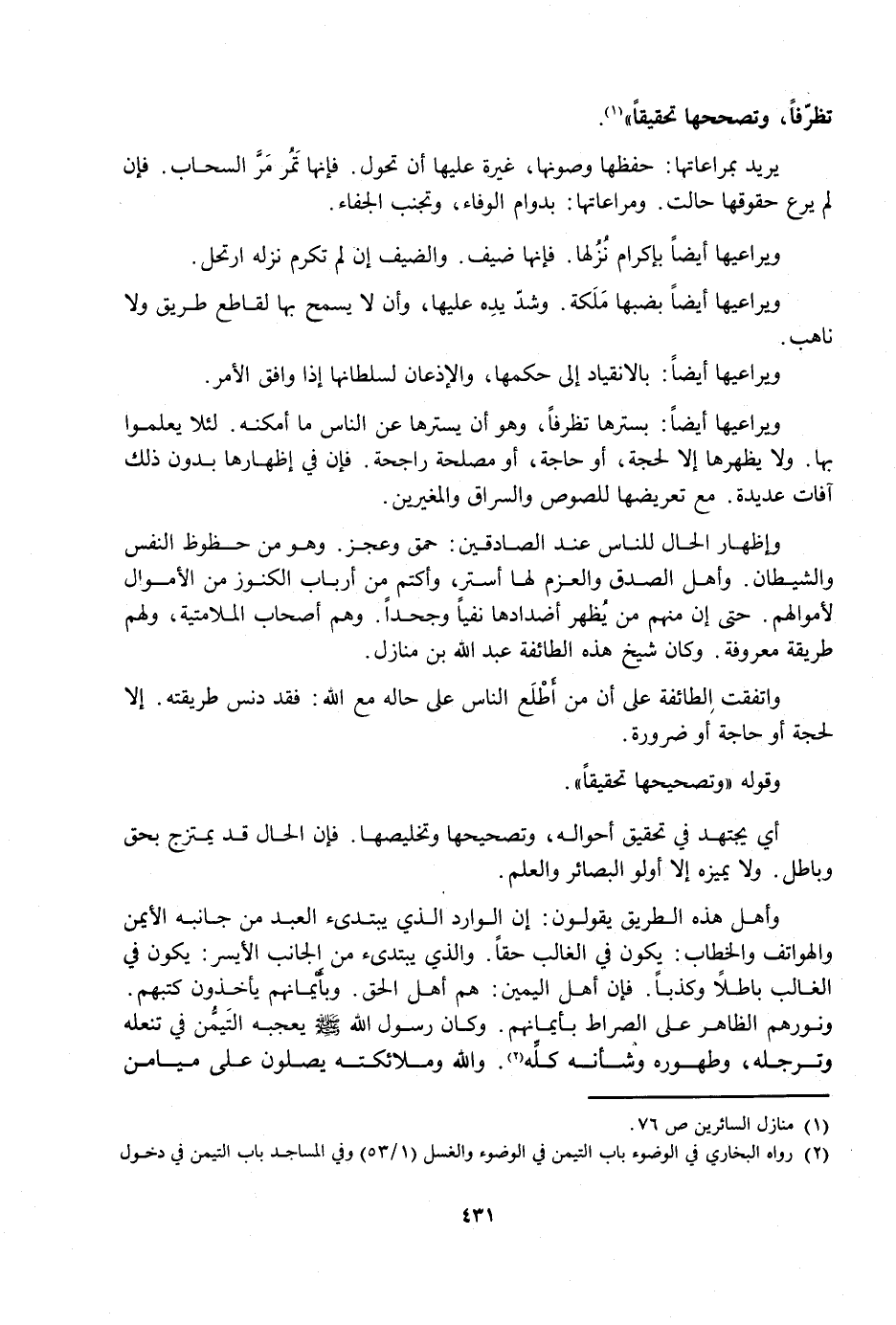 وَأَهْلُ هَذِهِ الطَّرِيقِ يَقُولُونَ: إِنَّ الْوَارِدَ الَّذِي يَبْتَدِئُ الْعَبْدُ مِنْ جَانِبِهِ الْأَيْمَنِ وَالْهَوَاتِفَ وَالْخِطَابَ: يَكُونُ فِي الْغَالِبِ حَقًّا. وَالَّذِي يَبْتَدِئُ مِنَ الْجَانِبِ الْأَيْسَرِ: يَكُونُ فِي الْغَالِبِ بَاطِلًا وَكَذِبًا. فَإِنَّ أَهْلَ الْيَمِينِ: هُمْ أَهْلُ الْحَقِّ. وَبِأَيْمَانِهِمْ يَأْخُذُونَ كُتُبَهُمْ. وَنُورُهُمُ الظَّاهِرُ عَلَى الصِّرَاطِ بِأَيْمَانِهِمْ. وَكَانَ رَسُولُ اللَّهِ صَلَّى اللَّهُ عَلَيْهِ وَسَلَّمَ يُعْجِبُهُ التَّيَمُّنُ فِي تَنَعُّلِهِ وَتَرَجُّلِهِ، وَطَهُورِهِ وَشَأْنِهِ كُلِّهِ. وَاللَّهُ وَمَلَائِكَتُهُ يُصَلُّونَ عَلَى مَيَامِنِ