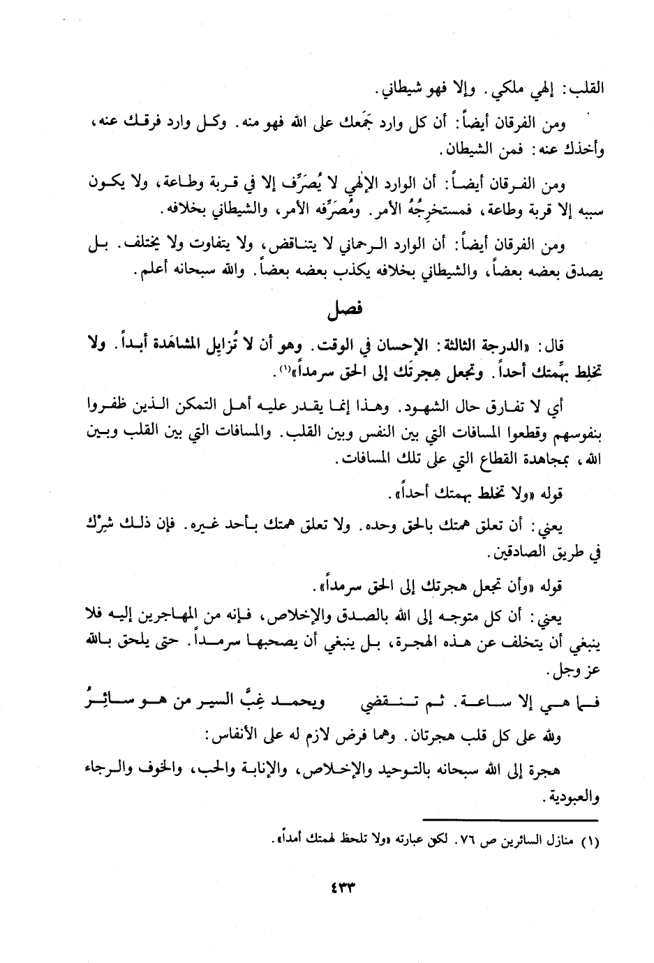 قَالَ: الدَّرَجَةُ الثَّالِثَةُ: الْإِحْسَانُ فِي الْوَقْتِ. وَهُوَ أَنْ لَا تُزَايِلَ الْمُشَاهَدَةَ أَبَدًا. وَلَا تَخْلِطَ بِهِمَّتِكَ أَحَدًا. وَتَجْعَلَ هِجْرَتَكَ إِلَى الْحَقِّ سَرْمَدًا.