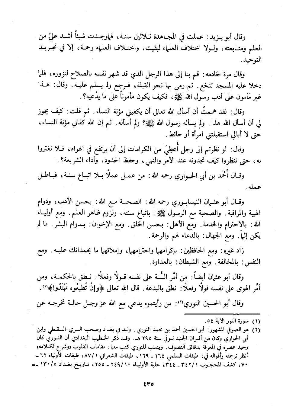 وَقَالَ أَبُو الْحُسَيْنِ النُّورِيُّ: مَنْ رَأَيْتُمُوهُ يَدَّعِي مَعَ اللَّهِ عَزَّ وَجَلَّ حَالَةً تُخْرِجُهُ عَنْ