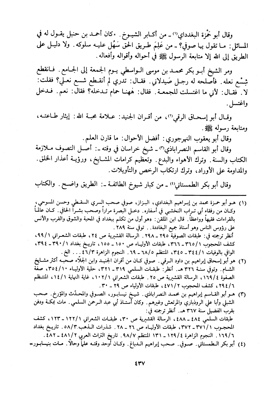 وَقَالَ أَبُو حَمْزَةَ الْبَغْدَادِيُّ - مِنْ أَكَابِرِ الشُّيُوخِ. وَكَانَ أَحْمَدُ بْنُ حَنْبَلٍ يَقُولُ لَهُ فِي الْمَسَائِلِ: مَا تَقُولُ يَا صُوفِيُّ - مَنْ عَلِمَ طَرِيقَ الْحَقِّ سَهُلَ عَلَيْهِ سُلُوكُهُ. وَلَا دَلِيلَ عَلَى الطَّرِيقِ إِلَى اللَّهِ إِلَّا مُتَابَعَةُ الرَّسُولِ صَلَّى اللَّهُ عَلَيْهِ وَسَلَّمَ فِي أَحْوَالِهِ وَأَقْوَالِهِ وَأَفْعَالِهِ.