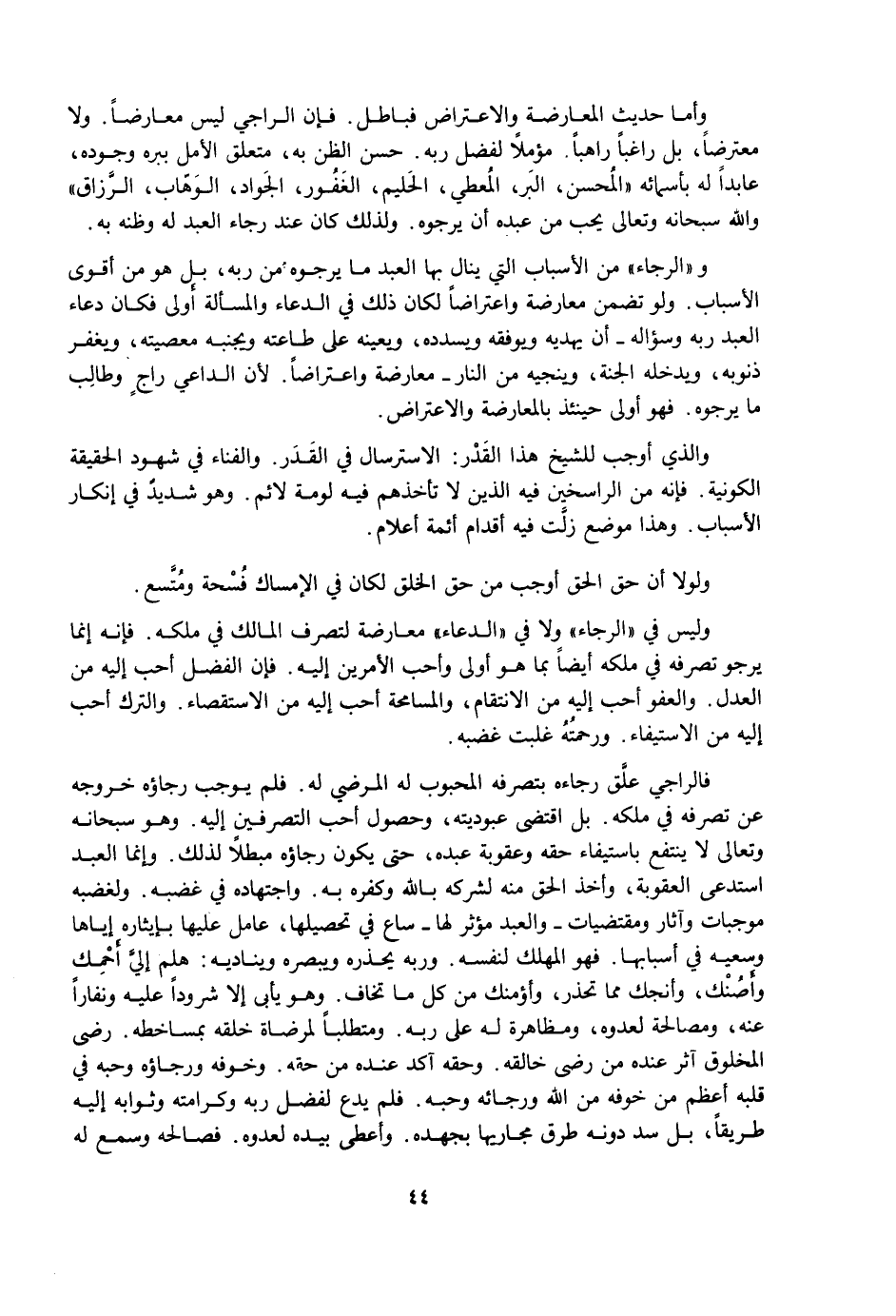 وَأَمَّا حَدِيثُ الْمُعَارَضَةِ وَالِاعْتِرَاضِ فَبَاطِلٌ. فَإِنَّ الرَّاجِيَ لَيْسَ مُعَارِضًا. وَلَا مُعْتَرِضًا، بَلْ رَاغِبًا رَاهِبًا. مُؤَمِّلًا لِفَضْلِ رَبِّهِ. حَسَنَ الظَّنِّ بِهِ، مُتَعَلِّقَ الْأَمَلِ بِبِرِّهِ وَجُودِهِ، عَابِدًا لَهُ بِأَسْمَائِهِ: الْمُحْسِنِ، الْبَرِّ، الْمُعْطِي، الْحَلِيمِ، الْغَفُورِ، الْجَوَادِ، الْوَهَّابِ، الرَّزَاقِ. وَاللَّهُ سُبْحَانَهُ وَتَعَالَى يُحِبُّ مِنْ عَبْدِهِ أَنْ يَرْجُوَهُ. وَلِذَلِكَ كَانَ عِنْدَ رَجَاءِ الْعَبْدِ لَهُ وَظَنِّهِ بِهِ.