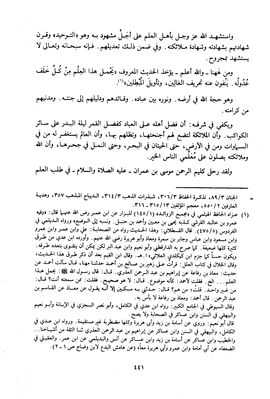 وَيَكْفِي فِي شَرَفِهِ: أَنَّ فَضْلَ أَهْلِهِ عَلَى الْعِبَادِ كَفَضْلِ الْقَمَرِ لَيْلَةِ الْبَدْرِ عَلَى سَائِرِ الْكَوَاكِبِ. وَأَنَّ الْمَلَائِكَةَ لَتَضَعُ لَهُمْ أَجْنِحَتَهَا، وَتُظِلُّهُمْ بِهَا، وَأَنَّ الْعَالِمَ يَسْتَغْفِرُ لَهُ مَنْ فِي السَّمَاوَاتِ وَمَنْ فِي الْأَرْضِ، حَتَّى الْحِيتَانُ فِي الْبَحْرِ، وَحَتَّى النَّمْلُ فِي جُحْرِهَا، وَأَنَّ اللَّهَ وَمَلَائِكَتَهُ يُصَلُّونَ عَلَى مُعَلِّمِي النَّاسِ الْخَيْرَ.