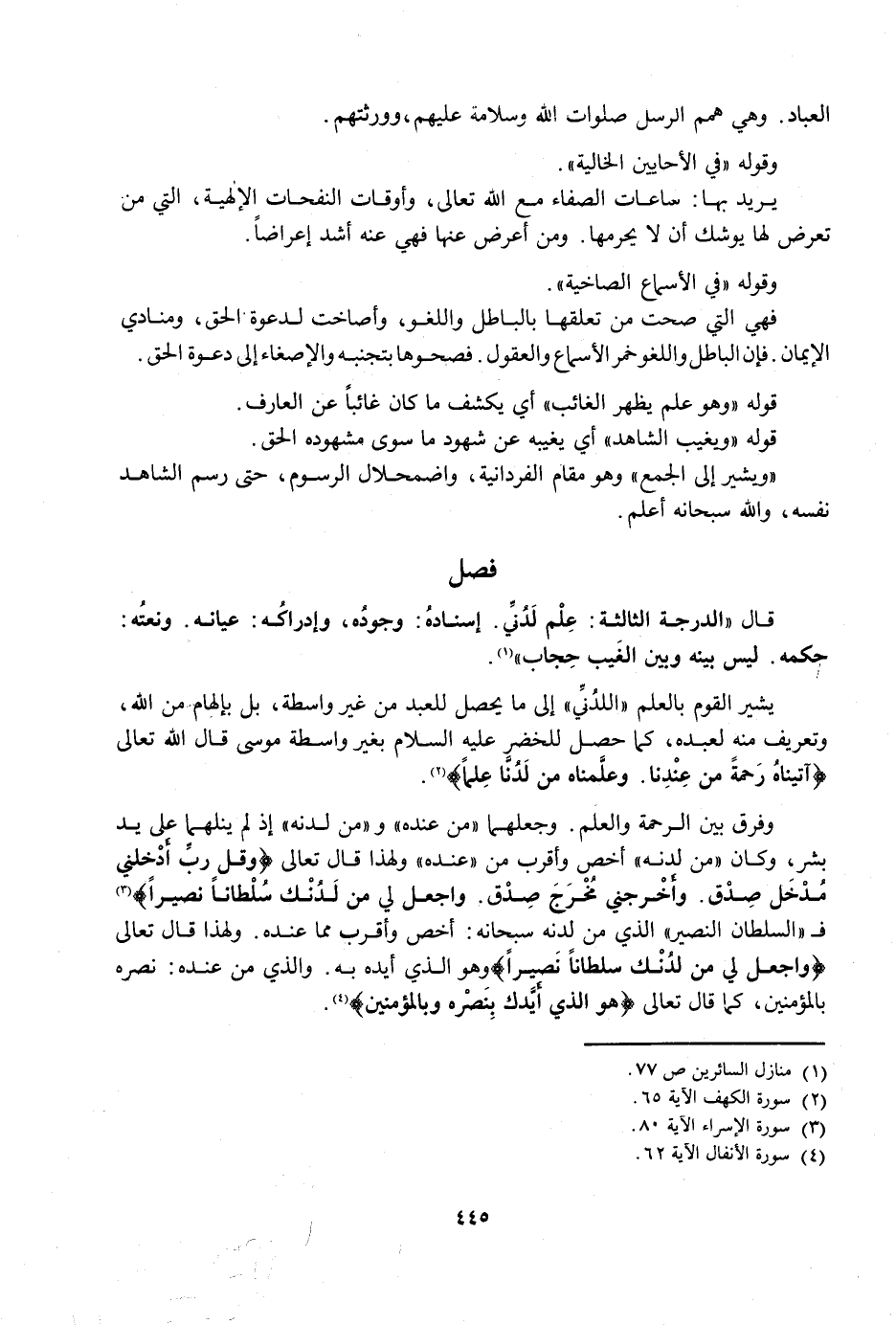 قَالَ الدَّرَجَةُ الثَّالِثَةُ: عِلْمٌ لَدُنِّيٌ. إِسْنَادُهُ وُجُودُهُ، وَإِدْرَاكُهُ عِيَانُهُ. وَنَعْتُهُ حُكْمُهُ. لَيْسَ بَيْنَهُ وَبَيْنَ الْغَيْبِ حِجَابٌ.