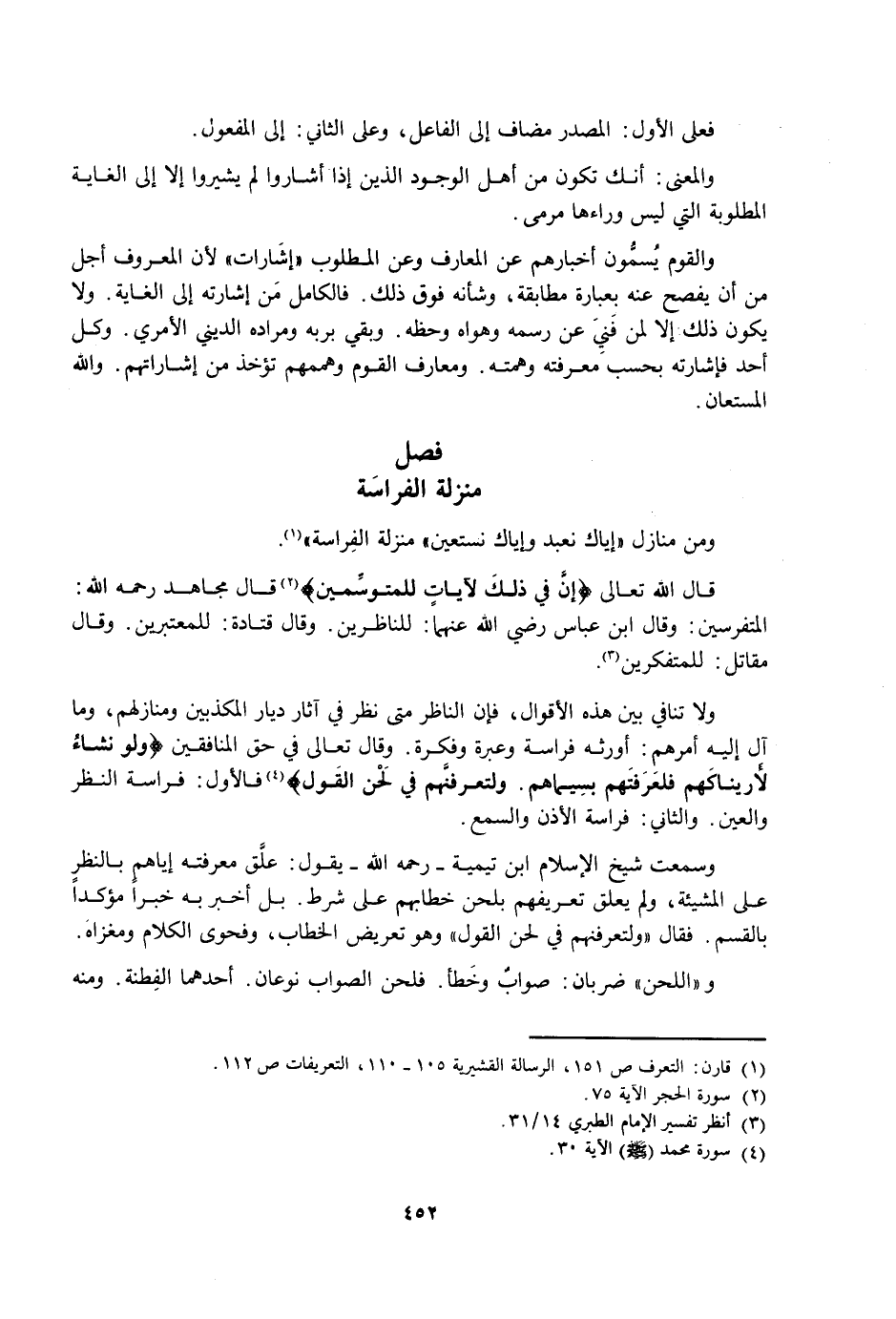 وَمِنْ مَنَازِلِ {إِيَّاكَ نَعْبُدُ وَإِيَّاكَ نَسْتَعِينُ} [الفاتحة: 5] مَنْزِلَةُ الْفِرَاسَةِ.