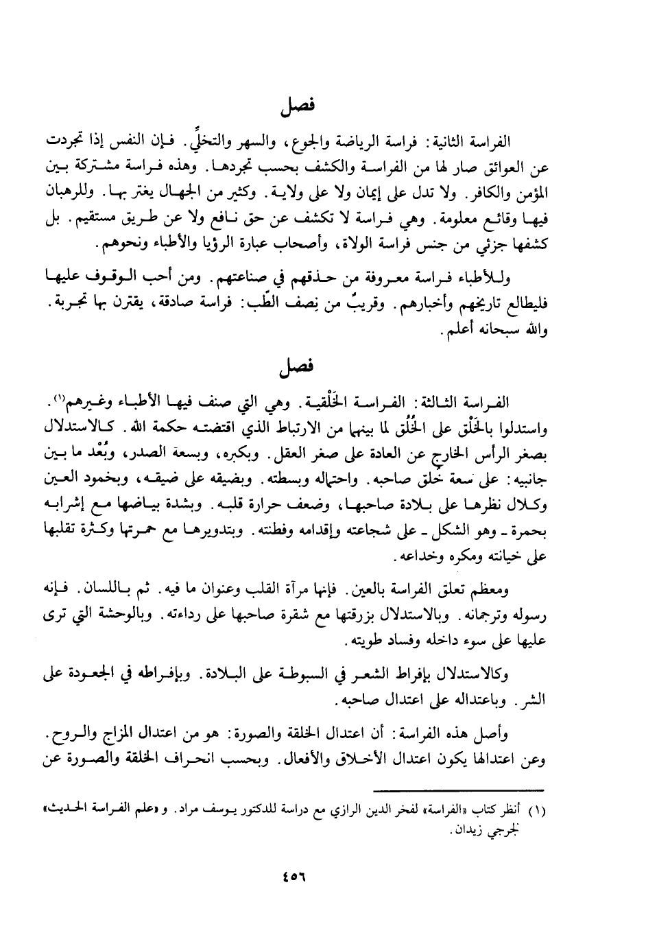 وَأَصْلُ هَذِهِ الْفِرَاسَةِ: أَنَّ اعْتِدَالَ الْخِلْقَةِ وَالصُّورَةِ: هُوَ مِنِ اعْتِدَالِ الْمِزَاجِ وَالرُّوحِ. وَعَنِ اعْتِدَالِهَا يَكُونُ اعْتِدَالُ الْأَخْلَاقِ وَالْأَفْعَالِ. وَبِحَسَبِ انْحِرَافِ الْخِلْقَةِ وَالصُّورَةِ عَنْ