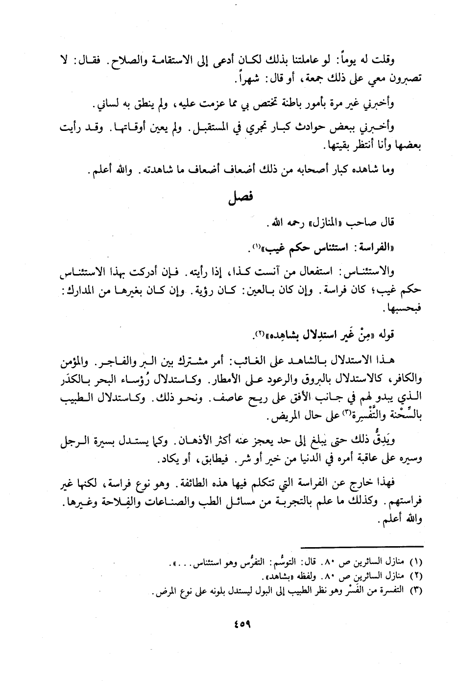 فَهَذَا خَارِجٌ عَنِ الْفِرَاسَةِ الَّتِي تَتَكَلَّمُ فِيهَا هَذِهِ الطَّائِفَةُ. وَهُوَ نَوْعُ فِرَاسَةٍ، لَكِنَّهَا غَيْرُ فِرَاسَتِهِمْ. وَكَذَلِكَ مَا عُلِمَ بِالتَّجْرِبَةِ مِنْ مَسَائِلِ الطِّبِّ وَالصِّنَاعَاتِ وَالْفِلَاحَةِ وَغَيْرِهَا. وَاللَّهُ أَعْلَمُ.