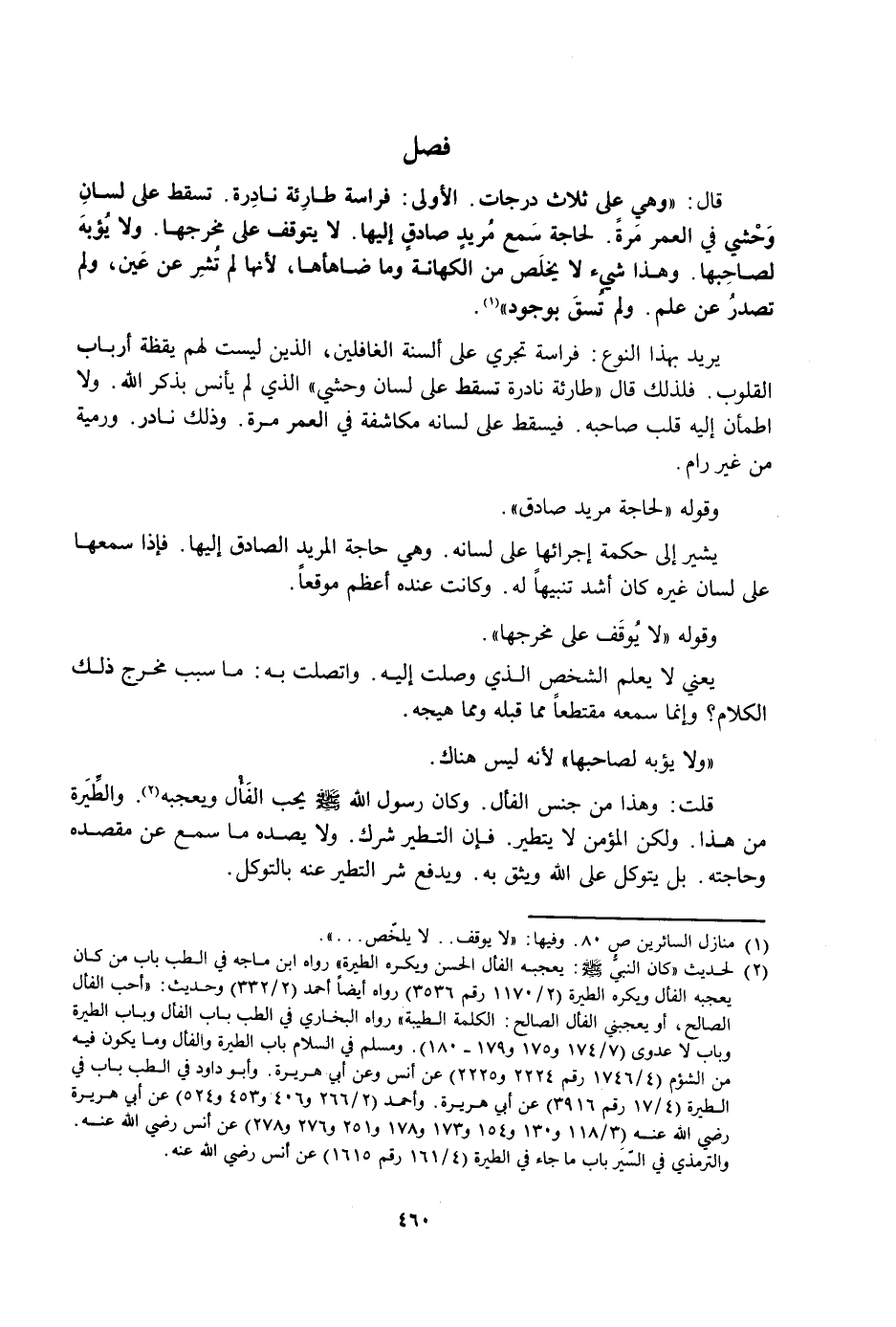 قُلْتُ: وَهَذَا مِنْ جِنْسِ الْفَأْلِ. وَكَانَ رَسُولُ اللَّهِ صَلَّى اللَّهُ عَلَيْهِ وَسَلَّمَ يُحِبُّ الْفَأْلَ وَيُعْجِبُهُ. وَالطِّيَرَةُ مِنْ هَذَا. وَلَكِنَّ الْمُؤْمِنَ لَا يَتَطَيَّرُ. فَإِنَّ التَّطَيُّرَ شِرْكٌ. وَلَا يَصُدُّهُ مَا سَمِعَ عَنْ مَقْصِدِهِ وَحَاجَتِهِ. بَلْ يَتَوَكَّلُ عَلَى اللَّهِ وَيَثِقُ بِهِ. وَيَدْفَعُ شَرَّ التَّطَيُّرِ عَنْهُ بِالتَّوَكُّلِ.