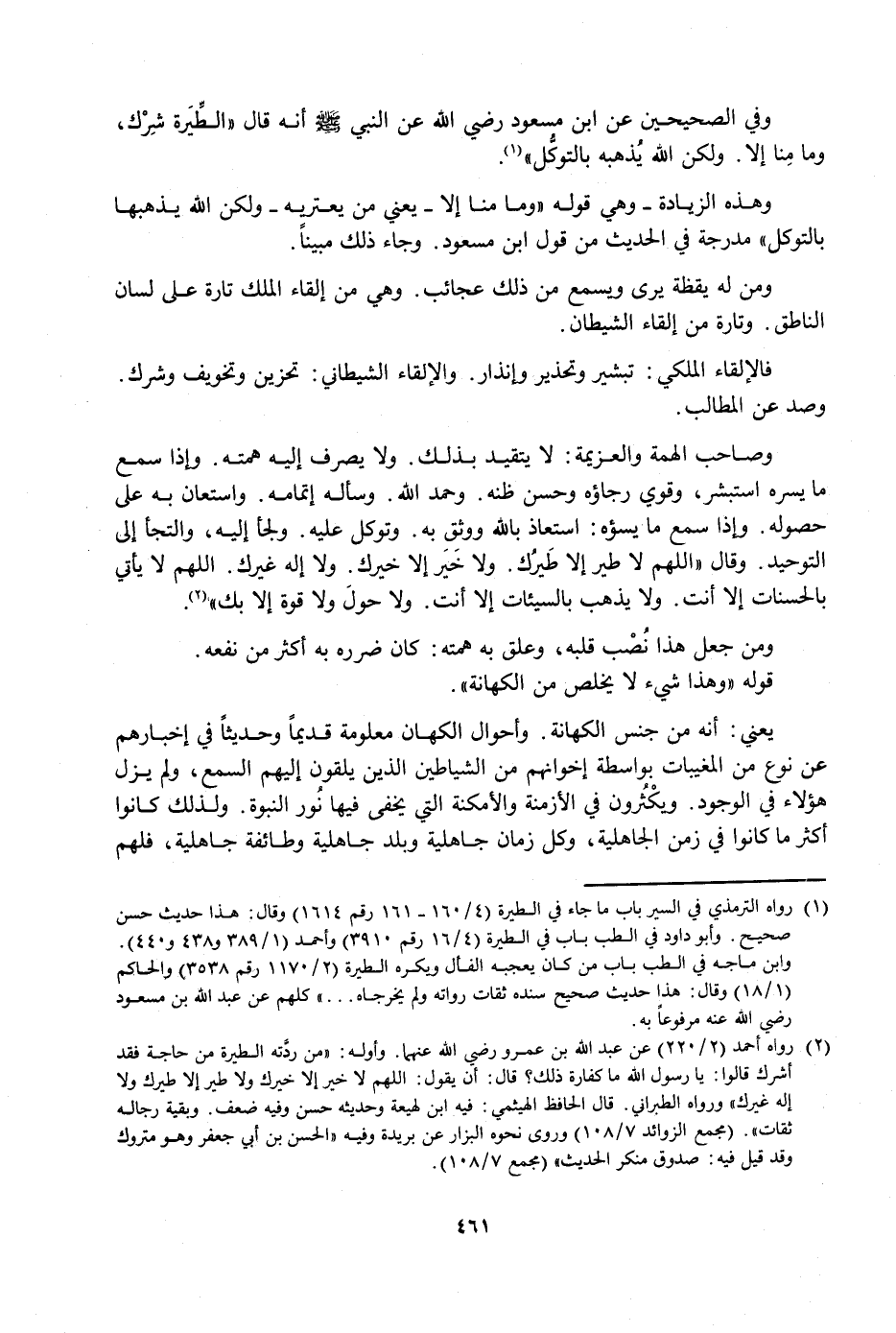 وَفِي الصَّحِيحَيْنِ عَنِ ابْنِ مَسْعُودٍ رَضِيَ اللَّهُ عَنْهُ عَنِ النَّبِيِّ صَلَّى اللَّهُ عَلَيْهِ وَسَلَّمَ أَنَّهُ قَالَ: «الطِّيَرَةُ شِرْكٌ، وَمَا مِنَّا إِلَّا. وَلَكِنَّ اللَّهَ يُذْهِبُهُ بِالتَّوَكُّلِ» .