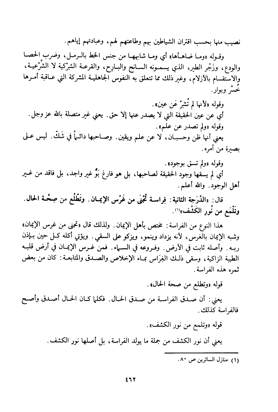 قَالَ: الدَّرَجَةُ الثَّانِيَةُ: فِرَاسَةٌ تُجْنَى عَنْ غَرْسِ الْإِيمَانِ. وَتَطْلُعُ مِنْ صِحَّةِ الْحَالِ. وَتَلْمَعُ مِنْ نُورِ الْكَشْفِ.