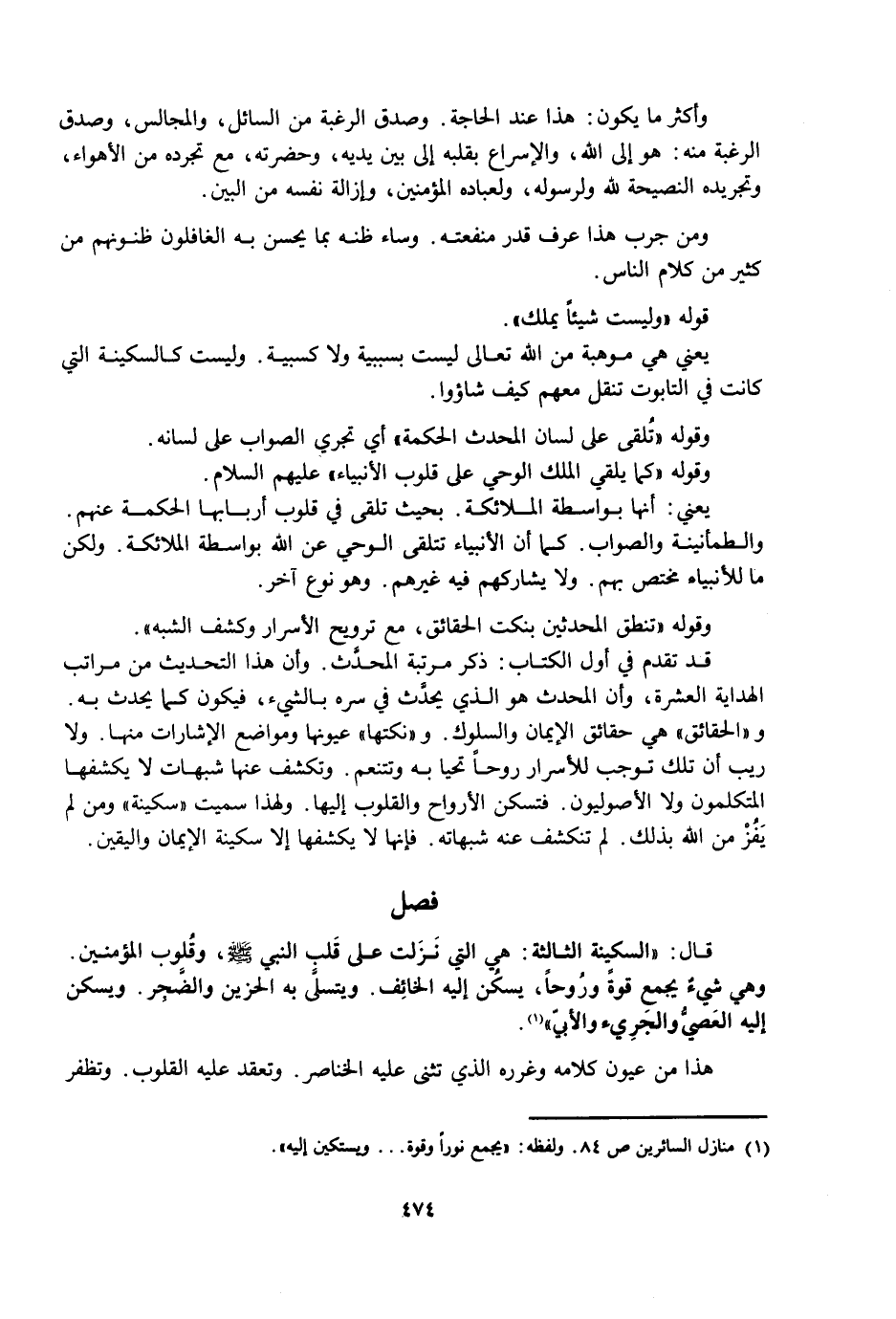 قَدْ تَقَدَّمَ فِي أَوَّلِ الْكِتَابِ: ذِكْرُ مَرْتَبَةِ الْمُحَدِّثِ، وَأَنَّ هَذَا التَّحْدِيثَ مِنْ مَرَاتِبِ الْهِدَايَةِ الْعَشَرَةِ، وَأَنَّ الْمُحَدِّثَ هُوَ الَّذِي يُحَدِّثُ فِي سِرِّهِ بِالشَّيْءِ، فَيَكُونُ كَمَا يُحَدِّثُ بِهِ. وَالْحَقَائِقُ هِيَ حَقَائِقُ الْإِيمَانِ وَالسُّلُوكِ. وَنُكَتُهَا عُيُونُهَا وَمَوَاضِعُ الْإِشَارَاتِ مِنْهَا. وَلَا رَيْبَ أَنَّ تِلْكَ تُوجِبُ لِلْأَسْرَارِ رُوحًا تَحْيَا بِهِ وَتَتَنَعَّمُ. وَتَكْشِفُ عَنْهَا شُبَهَاتٍ لَا يَكْشِفُهَا الْمُتَكَلِّمُونَ وَلَا الْأُصُولِيُّونَ. فَتَسْكُنُ الْأَرْوَاحُ وَالْقُلُوبُ إِلَيْهَا. وَلِهَذَا سُمِّيَتْ سَكِينَةً وَمَنْ لَمْ يَفُزْ مِنَ اللَّهِ بِذَلِكَ لَمْ تَنْكَشِفْ عَنْهُ شُبَهَاتُهُ. فَإِنَّهَا لَا يَكْشِفُهَا إِلَّا سَكِينَةُ الْإِيمَانِ وَالْيَقِينِ.