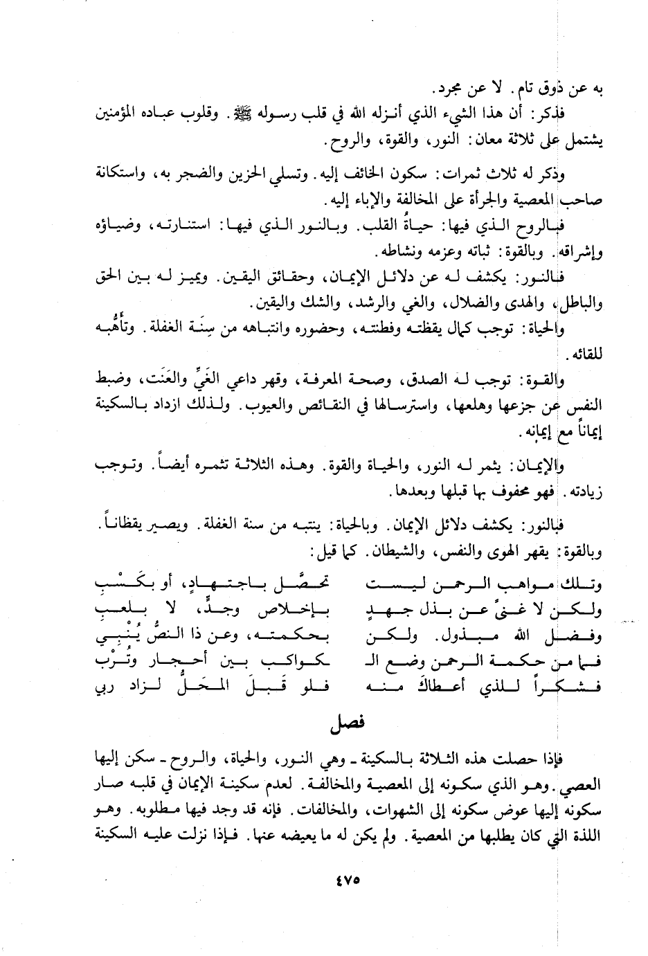 فَإِذَا حَصَلَتْ هَذِهِ الثَّلَاثَةُ بِالسَّكِينَةِ - وَهِيَ النُّورُ، وَالْحَيَاةُ وَالرُّوحُ - سَكَنَ إِلَيْهَا الْعِصِيُّ وَهُوَ الَّذِي سُكُونُهُ إِلَى الْمَعْصِيَةِ وَالْمُخَالَفَةِ؛ لِعَدَمِ سَكِينَةِ الْإِيمَانِ فِي قَلْبِهِ صَارَ سُكُونُهُ إِلَيْهَا عِوَضَ سُكُونِهِ إِلَى الشَّهَوَاتِ، وَالْمُخَالَفَاتِ. فَإِنَّهُ قَدْ وَجَدَ فِيهَا مَطْلُوبَهُ. وَهُوَ اللَّذَّةُ الَّتِي كَانَ يَطْلُبُهَا مِنَ الْمَعْصِيَةِ. وَلَمْ يَكُنْ لَهُ مَا يُعِيضُهُ عَنْهَا. فَإِذَا نَزَلَتْ عَلَيْهِ السَّكِينَةُ