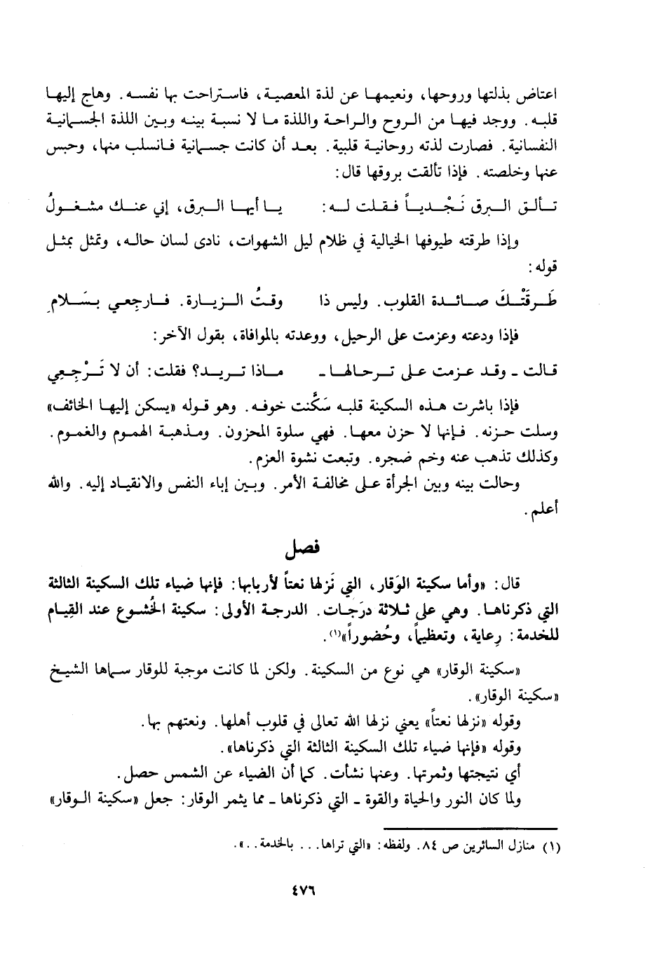 وَلَمَّا كَانَ النُّورُ وَالْحَيَاةُ وَالْقُوَّةُ - الَّتِي ذَكَرْنَاهَا - مِمَّا يُثْمِرُ الْوَقَارَ: جَعَلَ سَكِينَةَ الْوَقَارِ