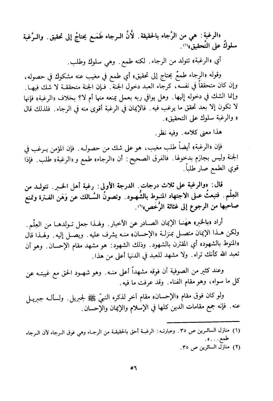 وَقَوْلُهُ: الرَّجَاءُ طَمَعٌ يَحْتَاجُ إِلَى تَحْقِيقِ أَيْ طَمَعٌ فِي مَغِيبٍ عَنْهُ مَشْكُوكٍ فِي حُصُولِهِ، وَإِنْ كَانَ مُتَحَقِّقًا فِي نَفْسِهِ، كَرَجَاءِ الْعَبْدِ دُخُولَ الْجَنَّةِ. فَإِنَّ الْجَنَّةَ مُتَحَقِّقَةٌ لَا شَكَّ فِيهَا. وَإِنَّمَا الشَّكُّ فِي دُخُولِهِ إِلَيْهَا. وَهَلْ يُوَافِي رَبَّهُ بِعَمَلٍ يَمْنَعُهُ مِنْهَا أَمْ لَا؟ بِخِلَافِ الرَّغْبَةِ فَإِنَّهَا لَا تَكُونُ إِلَّا بَعْدَ تَحَقُّقِ مَا يَرْغَبُ فِيهِ. فَالْإِيمَانُ فِي الرَّغْبَةِ أَقْوَى مِنْهُ فِي الرَّجَاءِ. فَلِذَلِكَ قَالَ: وَالرَّغْبَةُ سُلُوكٌ عَلَى التَّحْقِيقِ.