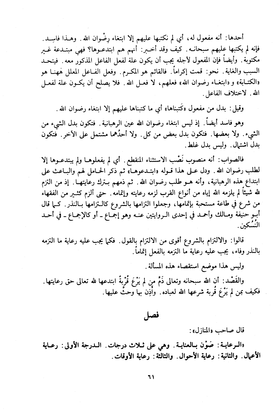 فَالصَّوَابُ أَنَّهُ مَنْصُوبٌ نَصْبَ الِاسْتِثْنَاءِ الْمُنْقَطِعِ. أَيْ لَمْ يَفْعَلُوهَا وَلَمْ يَبْتَدِعُوهَا إِلَّا لِطَلَبِ رِضْوَانِ اللَّهِ. وَدَلَّ عَلَى هَذَا قَوْلُهُ " ابْتَدَعُوهَا " ثُمَّ ذَكَرَ الْحَامِلَ لَهُمْ وَالْبَاعِثَ عَلَى ابْتِدَاعِ هَذِهِ الرَّهْبَانِيَّةِ، وَأَنَّهُ هُوَ طَلَبُ الرِّضْوَانِ. ثُمَّ ذَمَّهُمْ بِتَرْكِ رِعَايَتِهَا؛ إِذْ مَنِ الْتَزَمَ لِلَّهِ شَيْئًا لَمْ يُلْزِمْهُ اللَّهُ إِيَّاهُ مِنْ أَنْوَاعِ الْقُرَبِ لَزِمَهُ رِعَايَتَهُ وَإِتْمَامَهُ. حَتَّى أَلْزَمَ كَثِيرٌ مِنَ الْفُقَهَاءِ مَنْ شَرَعَ فِي طَاعَةٍ مُسْتَحَبَّةٍ حُكْمُهُ بِإِتْمَامِهَا. وَجَعَلُوا الْتِزَامَهَا بِالشُّرُوعِ كَالْتِزَامِهَا بِالنَّذْرِ. كَمَا قَالَ أَبُو حَنِيفَةَ وَمَالِكٌ وَأَحْمَدُ فِي إِحْدَى الرِّوَايَتَيْنِ عَنْهُ وَهُوَ إِجْمَاعٌ - أَوْ كَالْإِجْمَاعِ - فِي أَحَدِ النُّسُكَيْنِ.